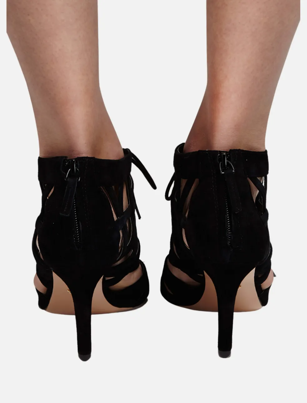 These chic yet comfortable Charlize black suede heels from Pour La Victoire feature an intricate lattice pattern with corset lacing and a back zipper closure.