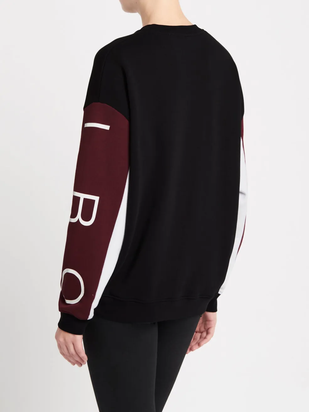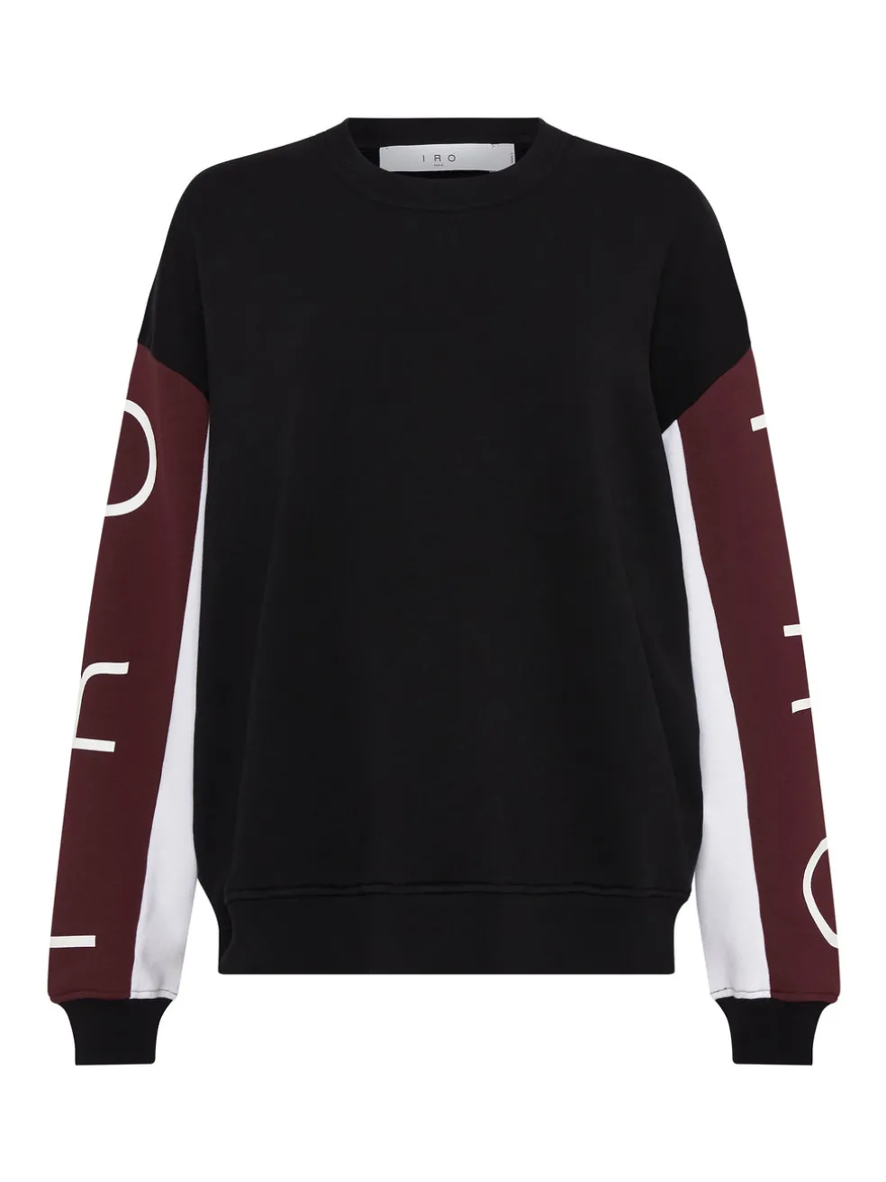 The IRO Coline Hoodie in Black/Burgundy is a sporty hooded sweatshirt. This heavyweight french terry cotton top features a fully lined hood with red and burgundy panelling on the chest and sleeves. A bold logo sits across the centre front, pair it back with your leather leggings for biker inspired style or match back with some blue denim for more casual vibes.
