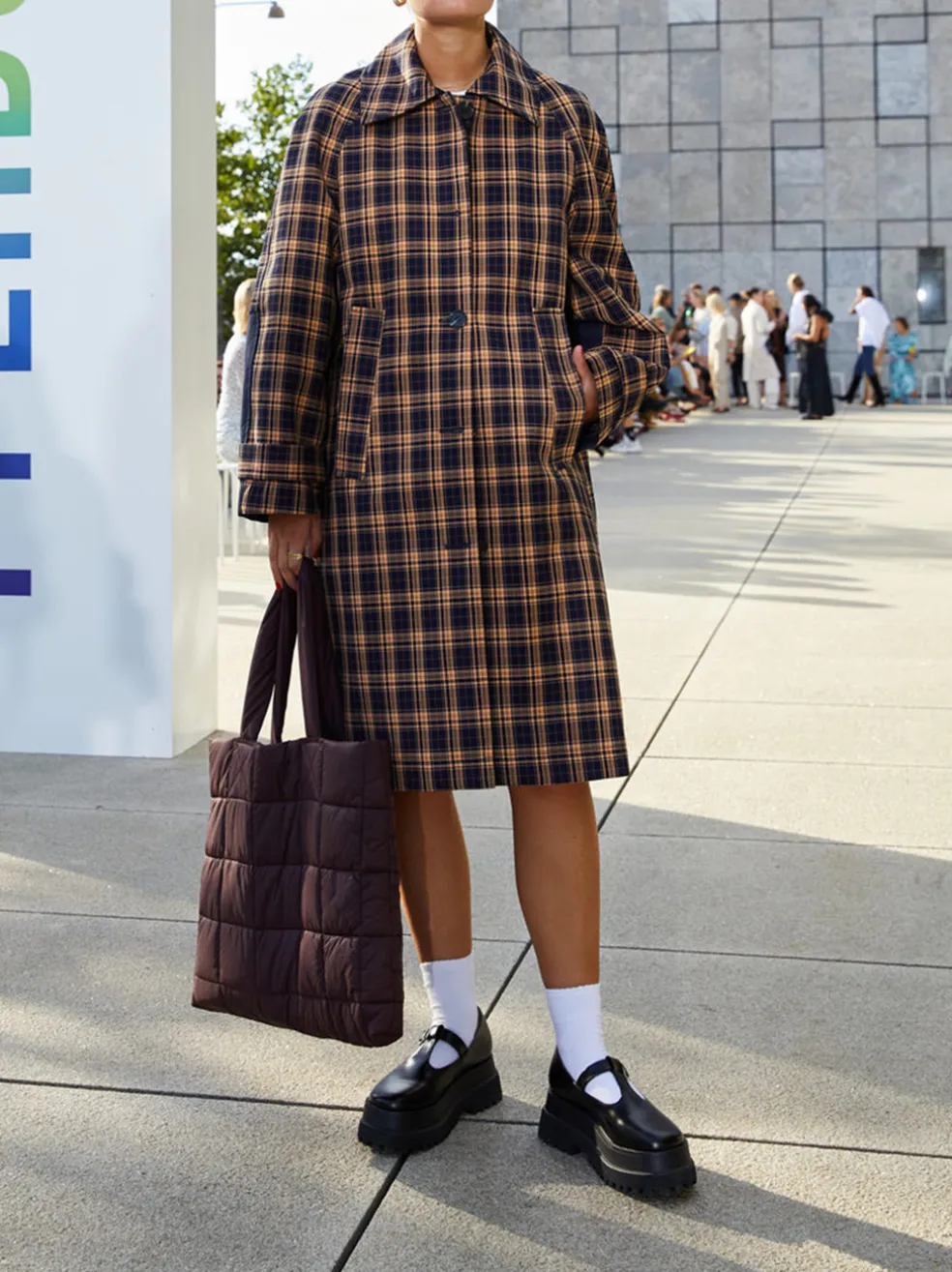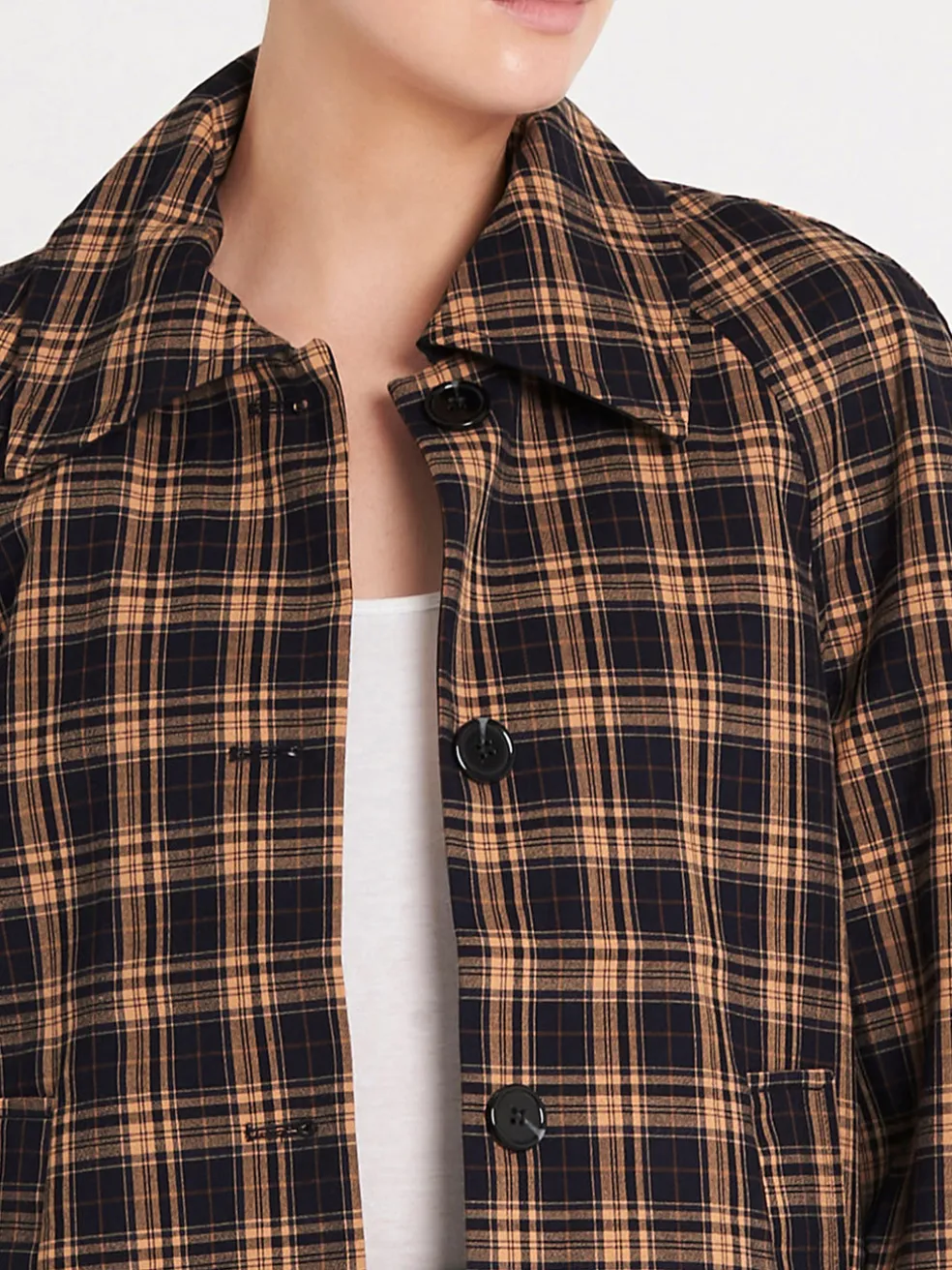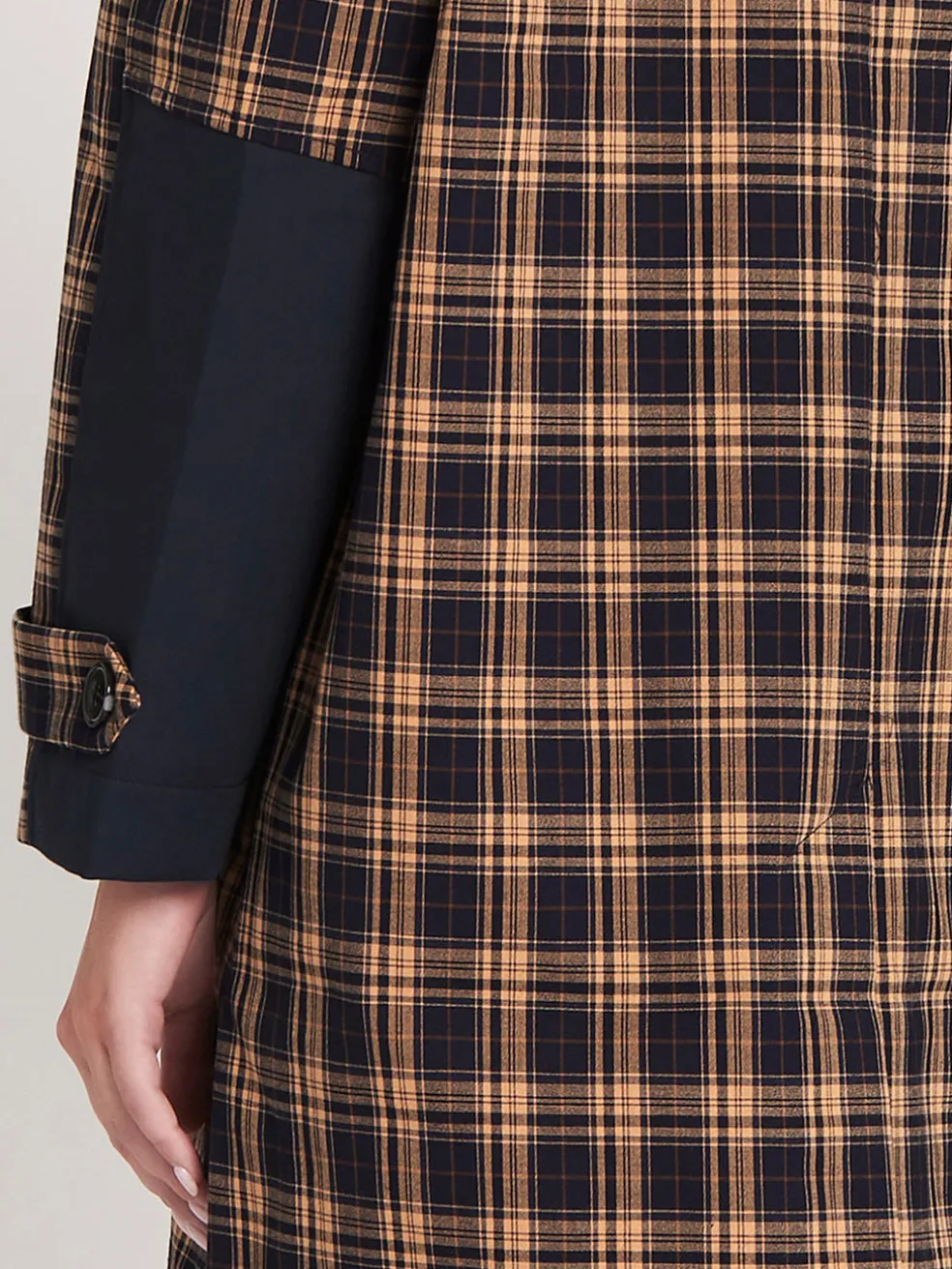The Baum Und Pferdgarten Danja Coat in Navy Orange Check is a long oversized trench coat with length below the knees. This is a statement Jacket featuring wide sleeves, side pockets, contrast paneling on the forearms, button closures at the front and is unlined.