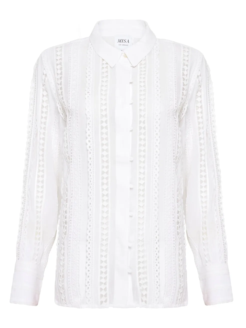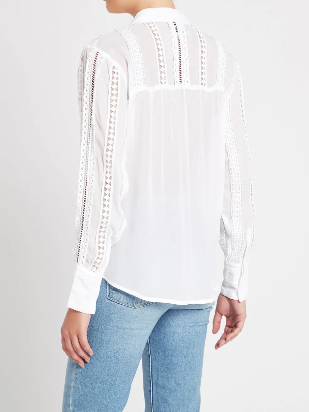 The classic white shirt gets a romantic update with the Misa Delia Top in White. Constructed from a soft viscose this long sleeve shirt features a classic collar, centre front black with hook and eye button closure and is finished with lace tram detailing running vertically through the shirt creating that feminine twist.