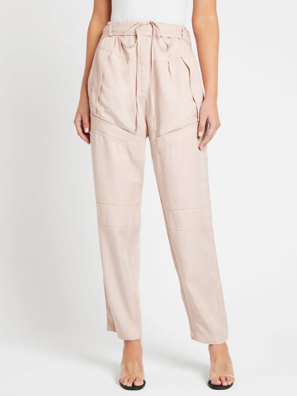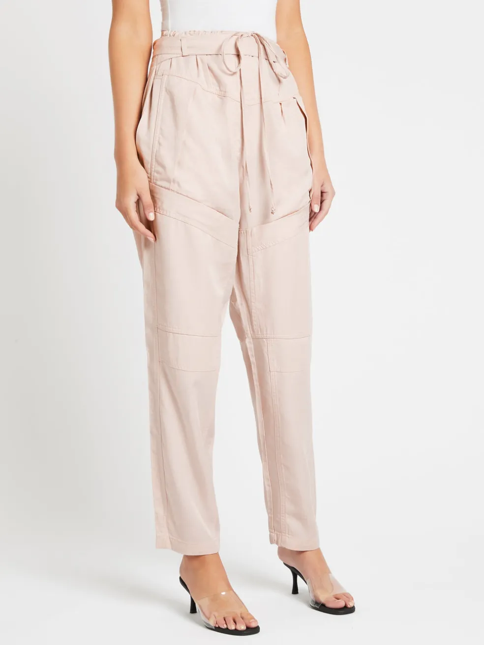 Give an update to your off duty style with the Dolci Pants in Light Pink by IRO. These soft and feminine fluid pants feature a high waisted silhouette with utility inspired accents of deep dual front pockets, waist belt tie and duel back trick pockets. Team back with a simple tee and boots for an effortless chic look.