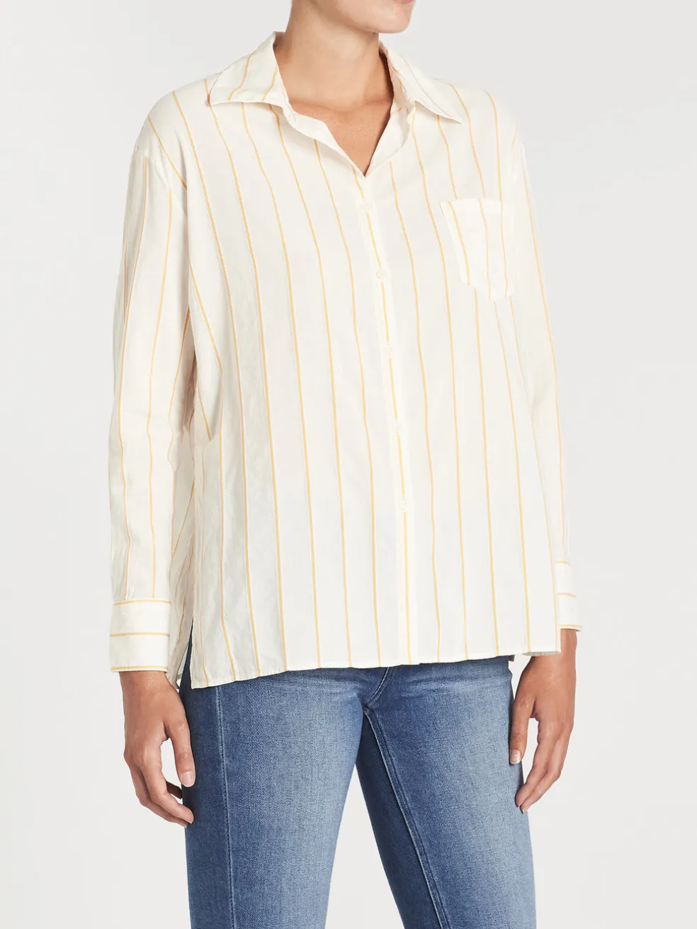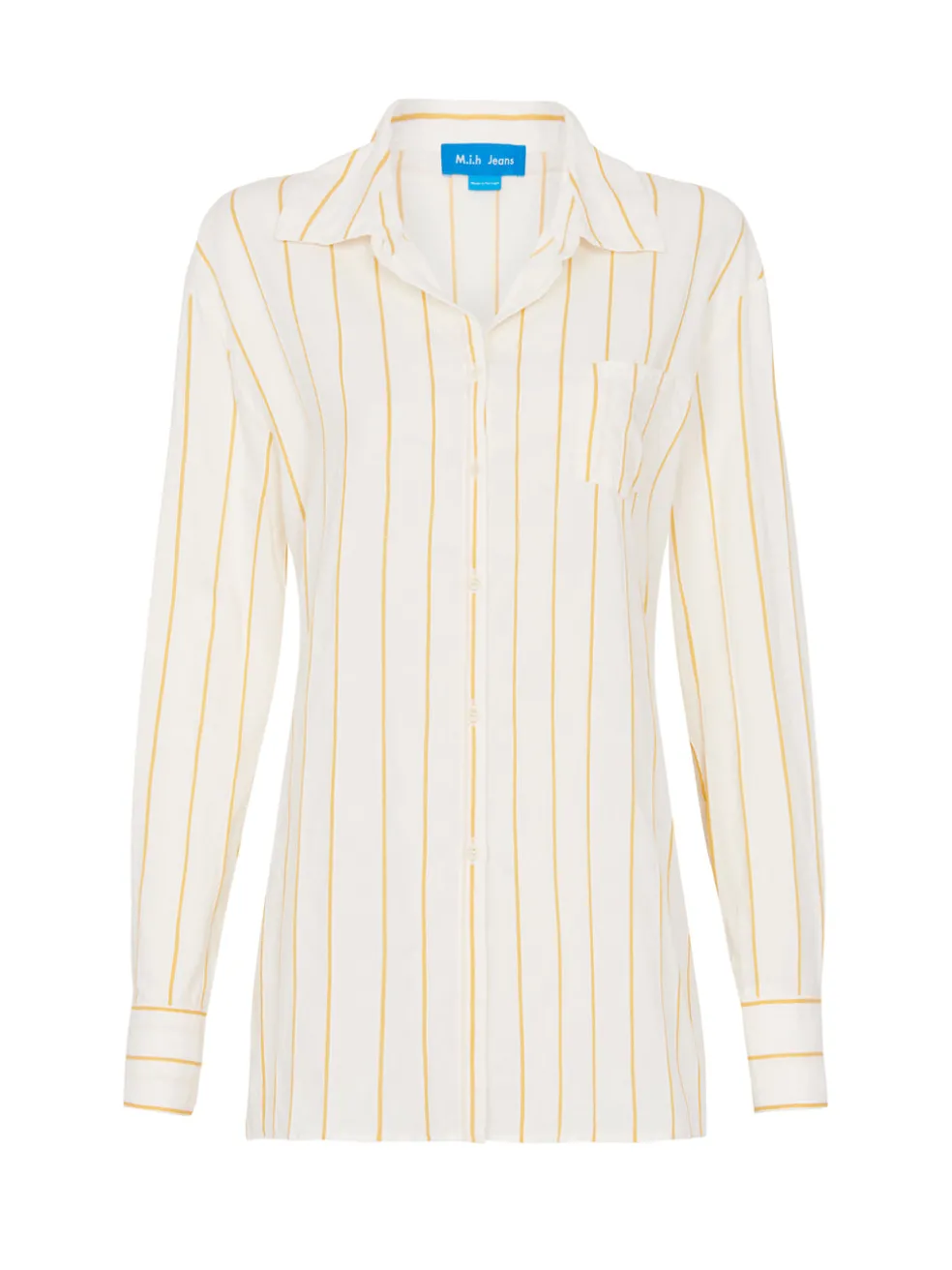 The M.i.h Jeans Dylan Shirt in Cream with a Mimosa stripe detail is the perfect classic piece to add to your spring wardrobe. Constructed from 100% cotton this modern take on the classic men’s shirt has a centre front button opening and 2cm longer front hemline. Pair with your favourite cropped high waisted boyfriend jeans and simple slides for an effortless weekend style.