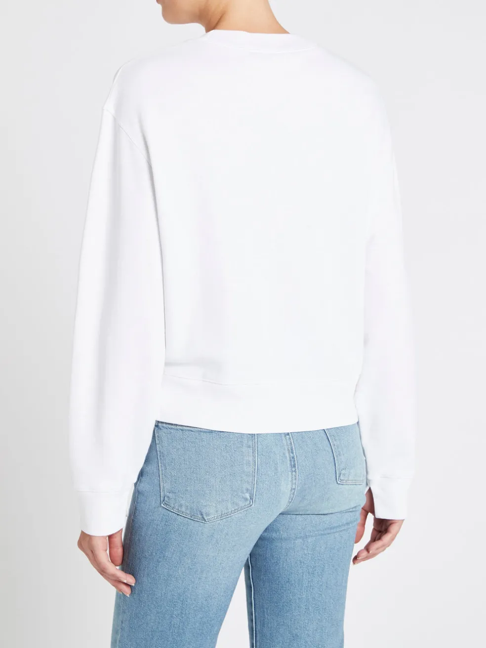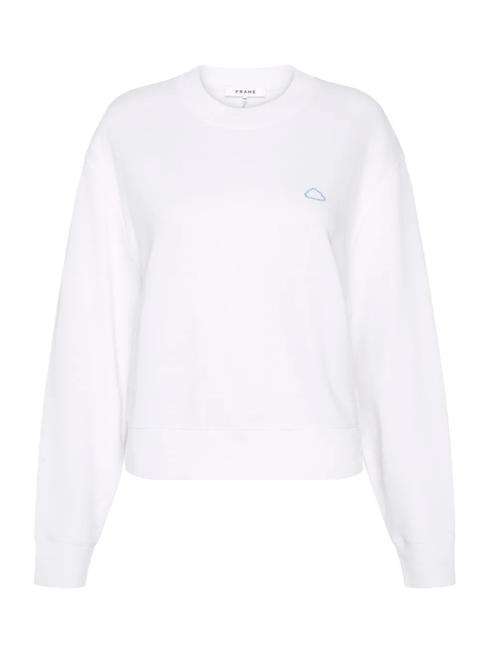 Cosy Up in the Frame Denim Easy Sweatshirt in Blanc. This sustainable sweatshirt is constructed from 100% Organic cotton this super snuggly sweatshirt features a round crew neckline, long sleeves and features a sweet cloud embroidery for a playful touch.