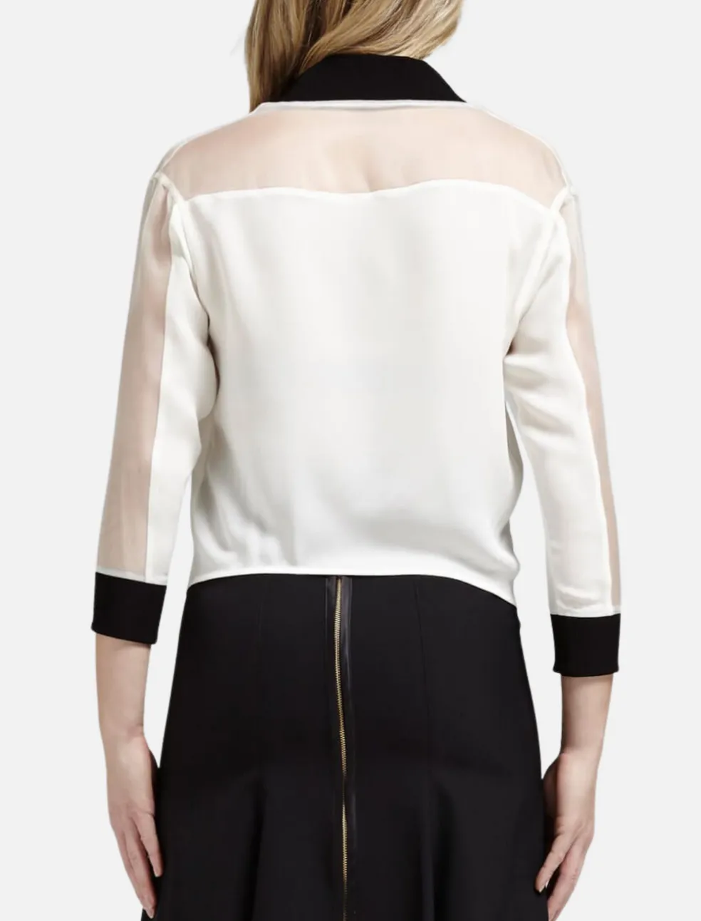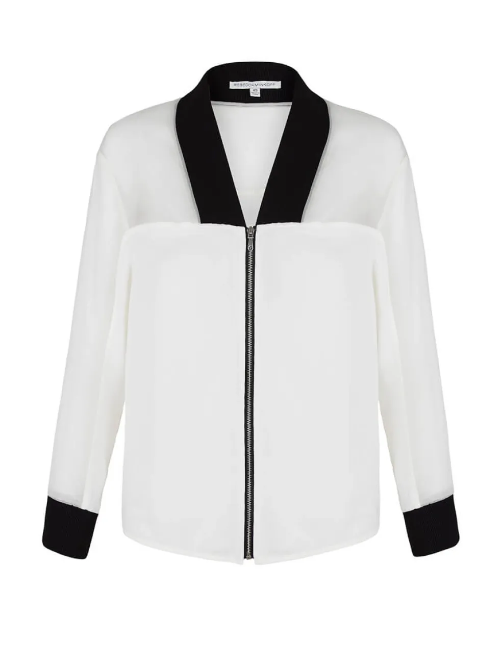 This scooped hem lightweight jacket from Rebecca Minkoff is a delicate spin on a sporty look, with sheer Organza panelling on the shoulders and sleeves, and black ribbed detailing on the neckline and cuffs. This is a piece that walks the line between masculinity and femininity.