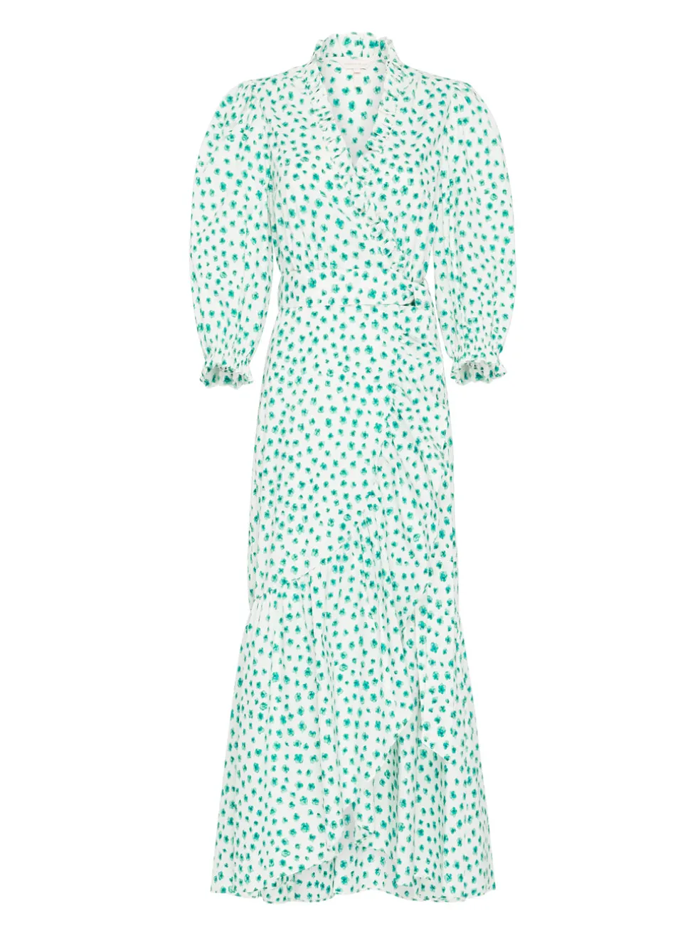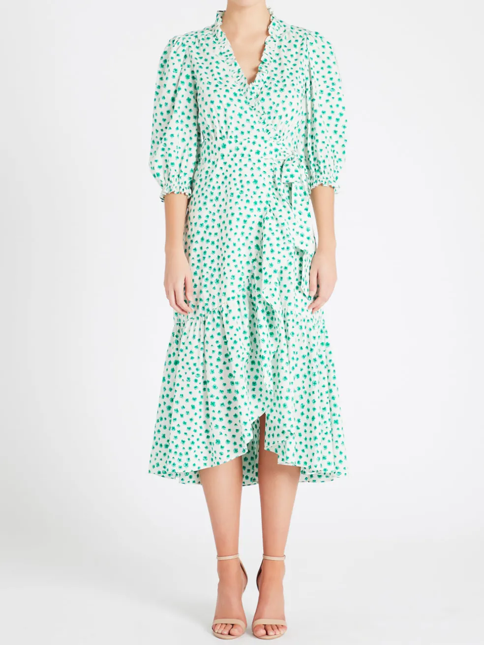 Radiate this season in the Emerald Daisy Dress by Rebecca Taylor. Crafted from crips cotton poplin this wrap front tie dress features a mini emerald-hued daisy print with voluminous long sleeves and is finished flowing ruffle detailing. Make this a versatile option as the seasons transition for an easy chic go to.