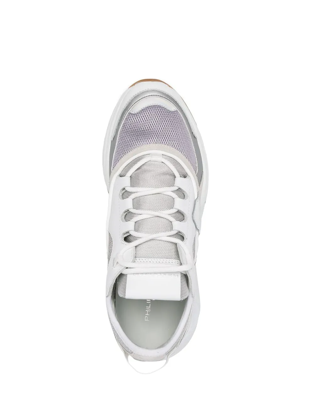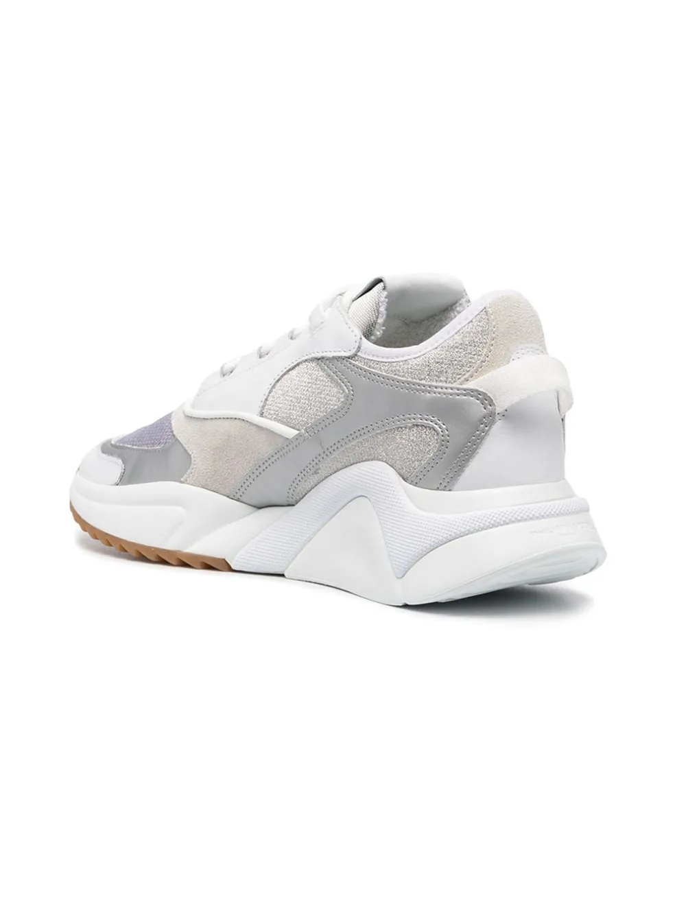 The chunky dad sneaker is reinvented in glitter and holographic leather cut away by Philippe Model. The Eze Sneaker in Glitter Argent is a must have staple piece for your go to denim looks this season. White and grey tones overlap across the shoe with a textural mesh toe, shining silver tongue and holographic details. The Eze sneaker features a pull on tab at the heel, and a cushioned platform midsole in a combination of fresh white and natural rubber sole. Dress down your evening wear or dress up your tracksuit with these fresh kicks.