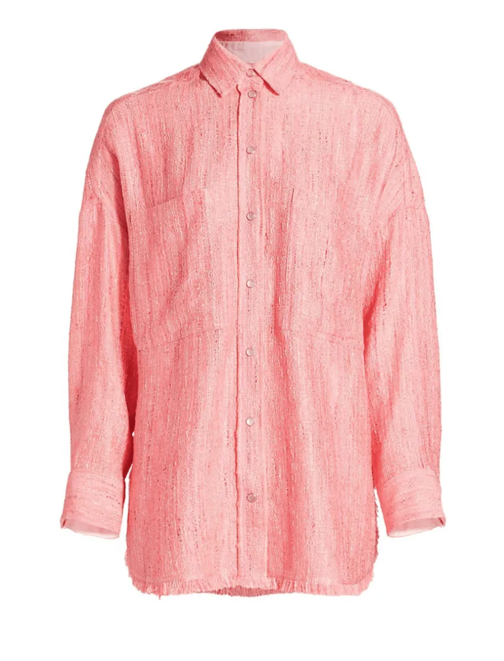 Blink and you still won’t miss me in the IRO Founda Overshirt. The textural details of the tweedy weave is enhance by the striking fluro Coral colour-way. Guaranteed to light up your day the over shirt is designed to be oversized and is perfect for wear over another top or light knit. Layer it with your fav jeans or leather leggings and throw on some kicks for street wear style that can’t be beat.