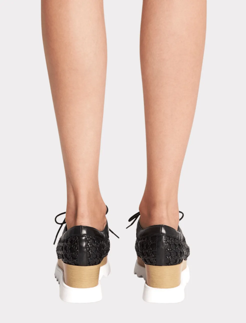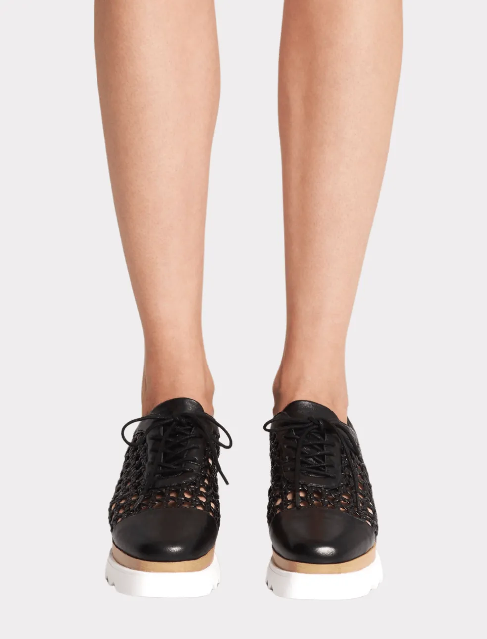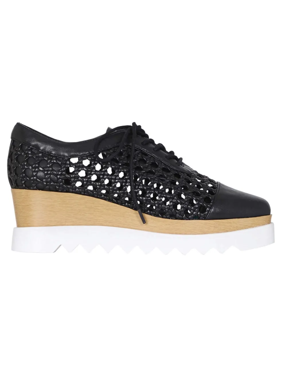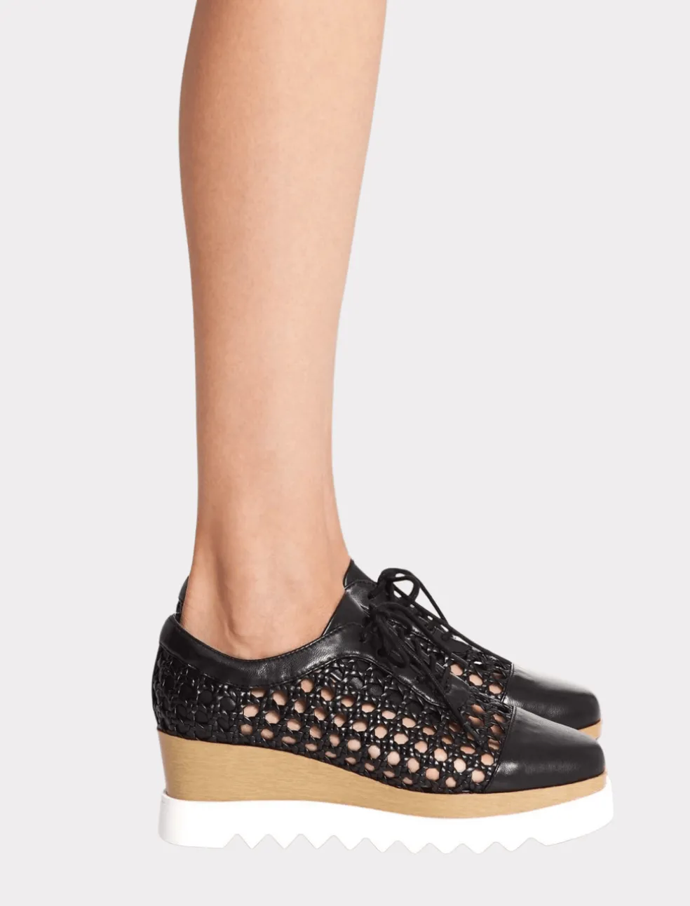 Classic style meets sports lux with the Sol Sana Fremont Wedge. This double layer flatform wedge features an upper body constructed from a Black woven leather with leather laces and a solid leather toe and back, a staked wood style wedge and is finished with a thick white rubber sole.