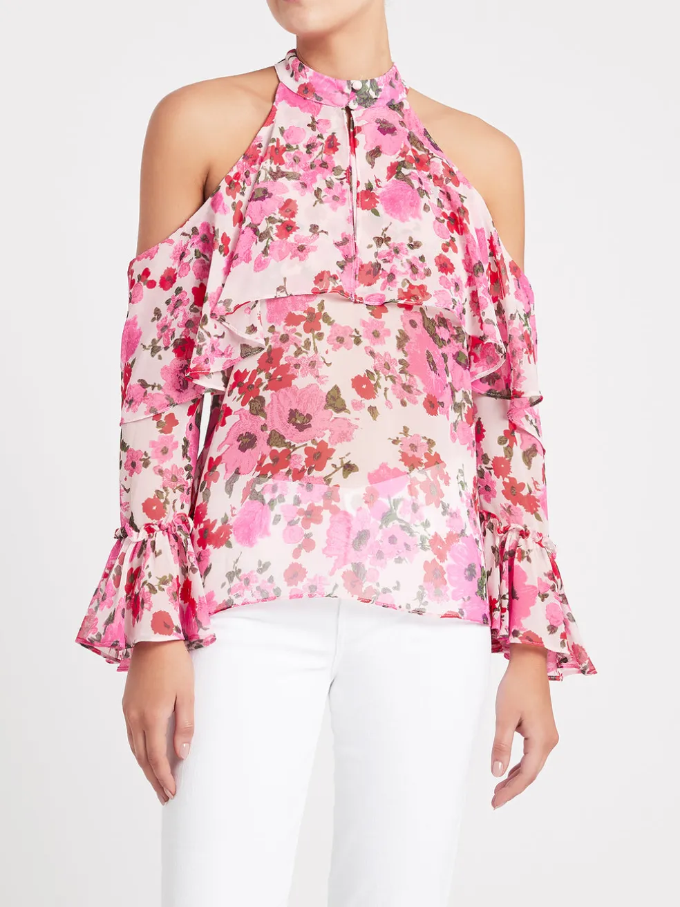 Turn heads in the Frieda Top by Misa Los Angeles. Crafted from beautiful viscose chiffon this halter neckline top features peak-a-boo sleeves which bare just the right amount of shoulder and is finished with sweet ruffles adorning the chest. Complete this look with the Elise Skirt by Misa Los Angeles for the ultimate garden party outfit.