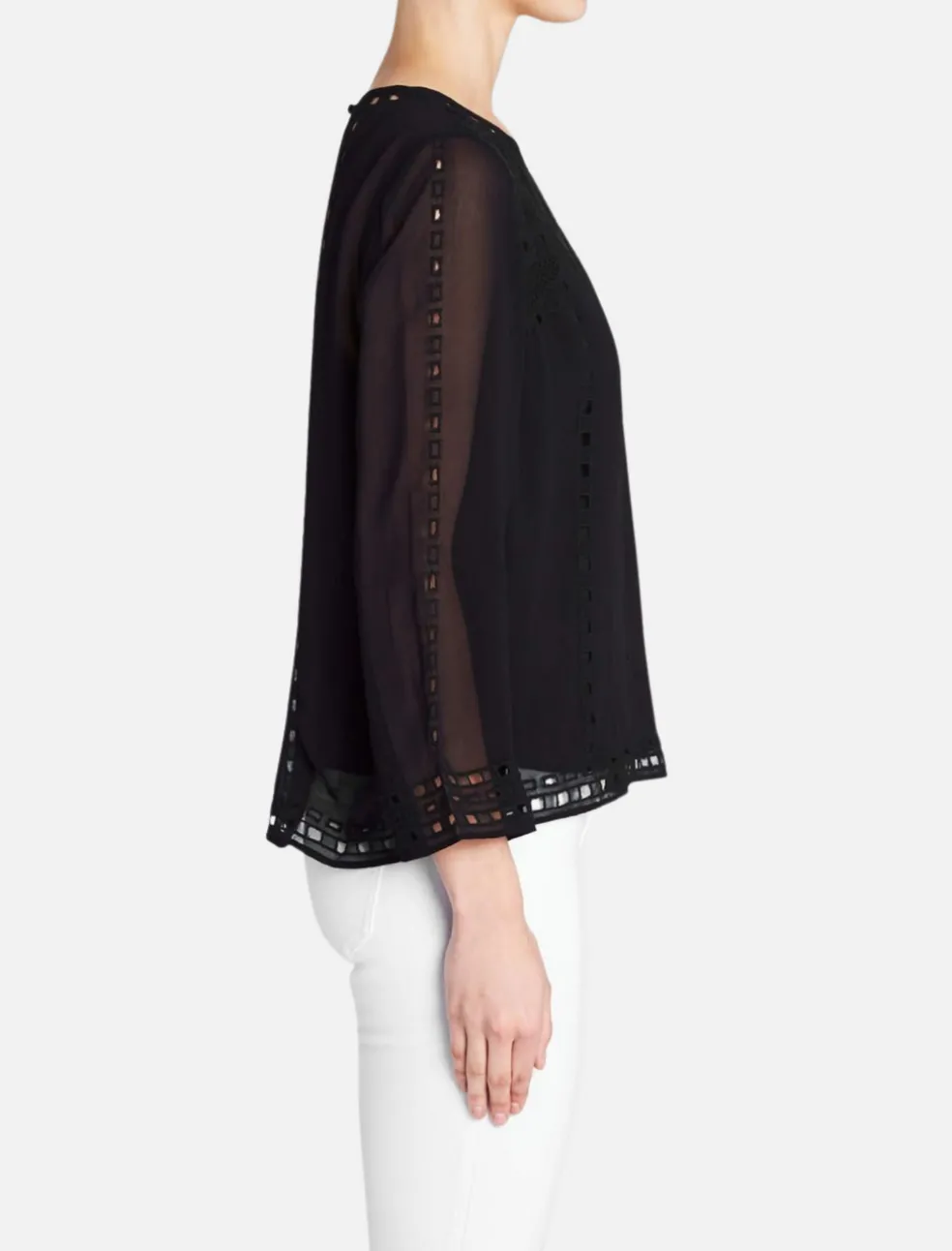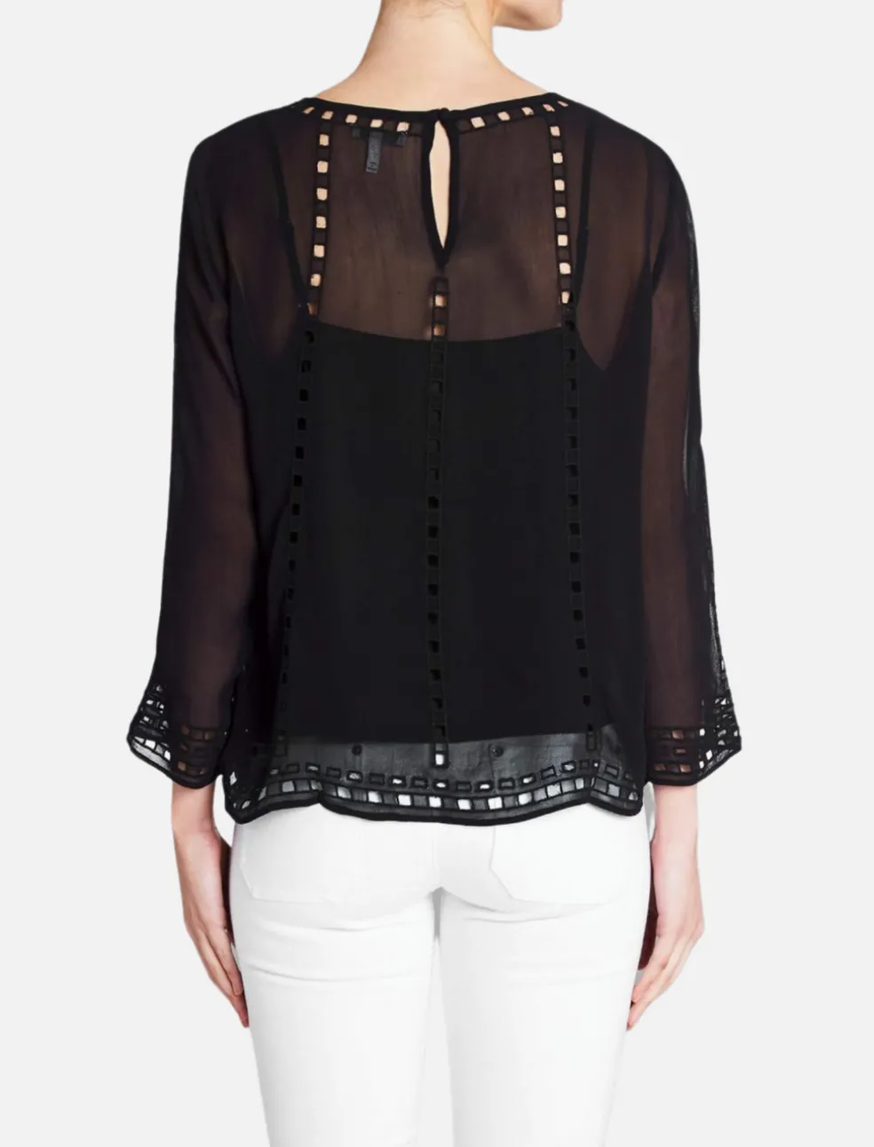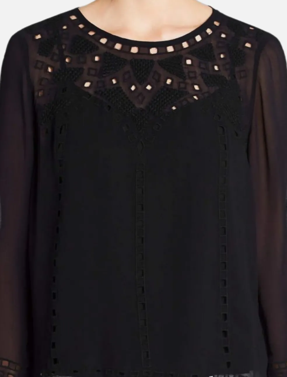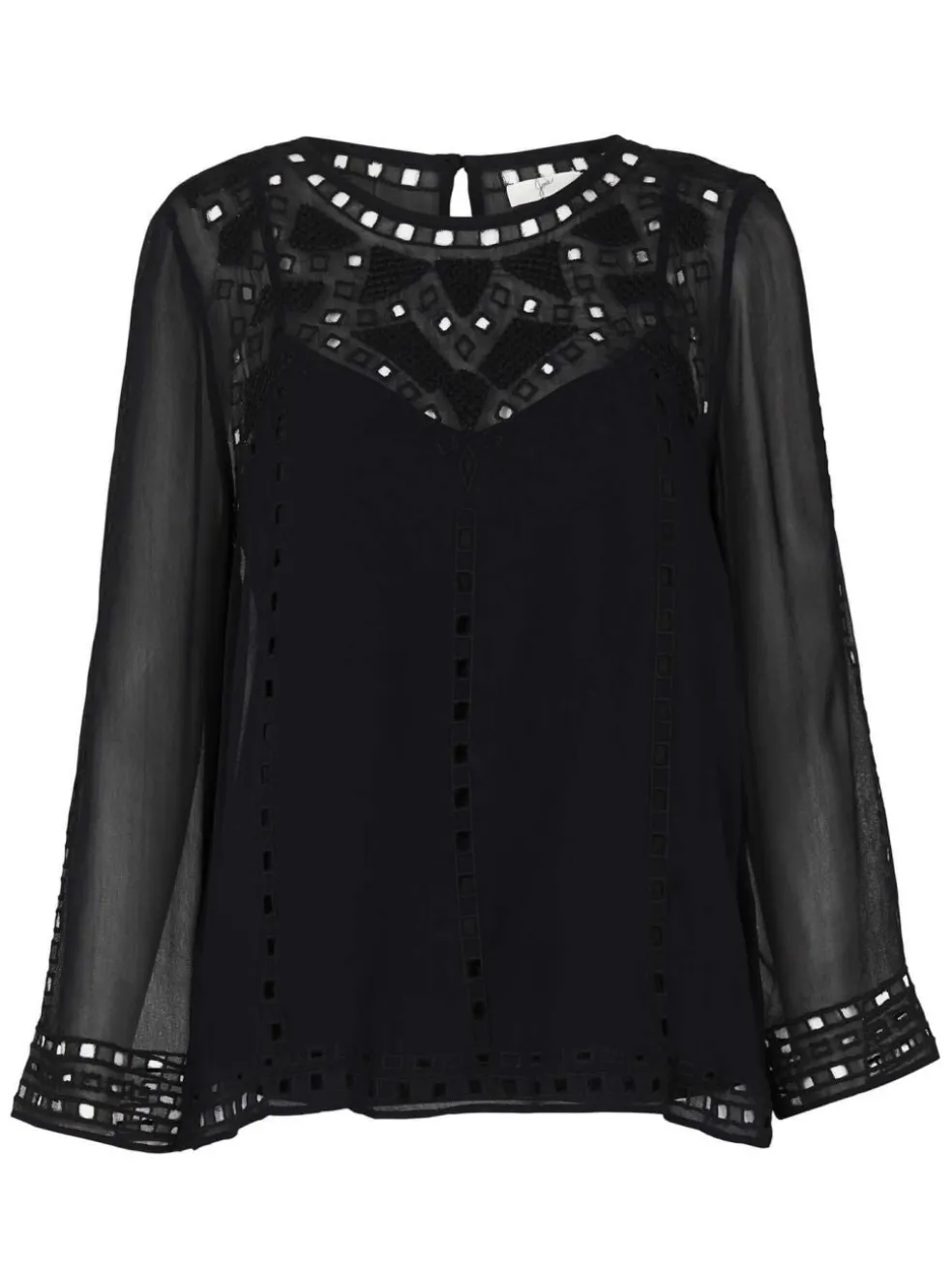 The Joie Gaiane Top is a delicately detailed black silk crepe blouse. The sheer, flowy silhouette is treated with stunning geometric embroidery, keyhole back closure and features bracelet length sleeves. Slip included.