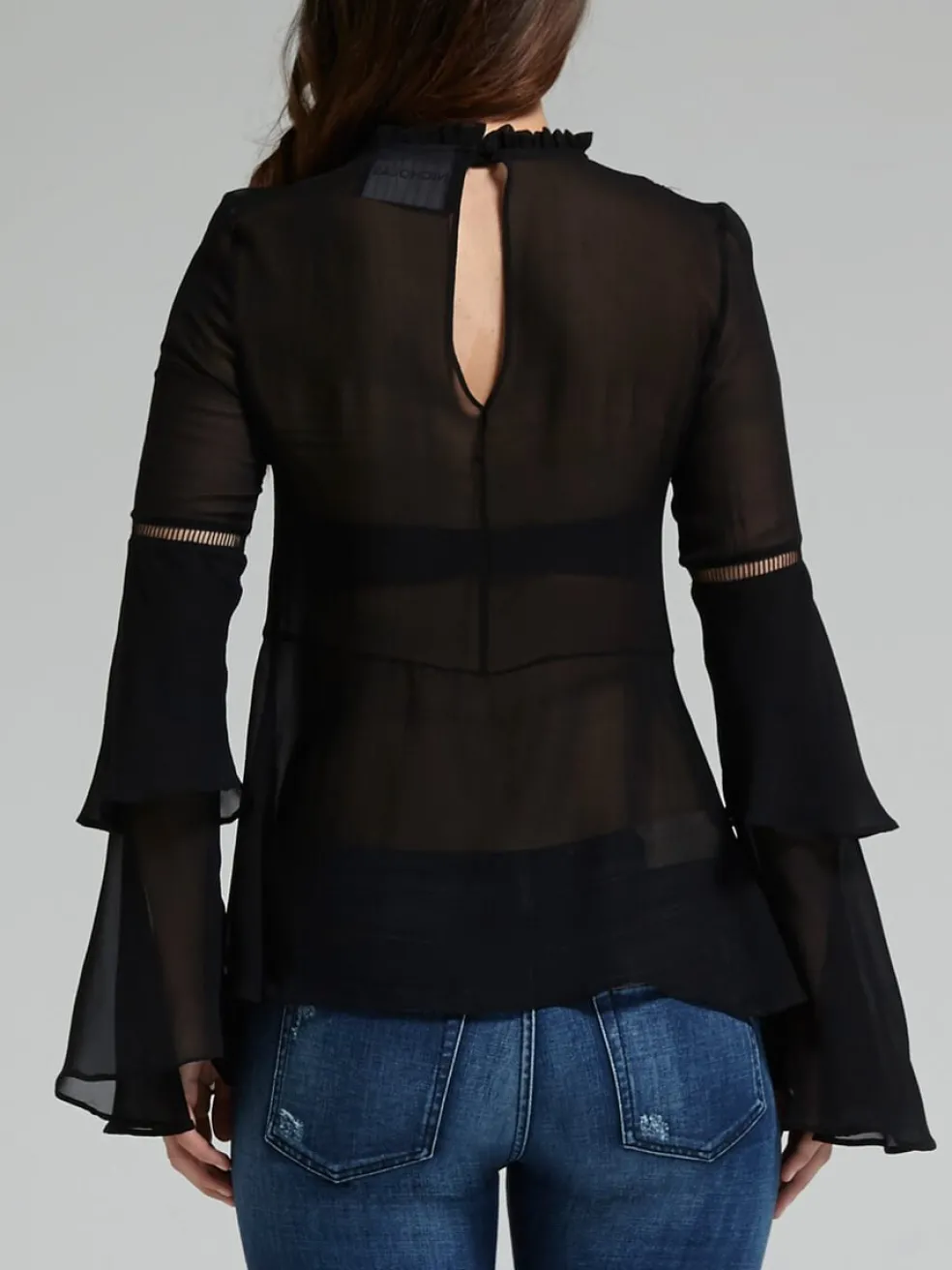 This sexy sheer Nicholas Georgette Layer Sleeve Top will have you channeling the best of the 90’s. Made from delicate sheer silk, the twin layered bell style sleeves are paired with a floaty yet form fitting body with embroidery edging lace inserts. Featuring a short frill banded collar and keyhole opening with button at the back neck.