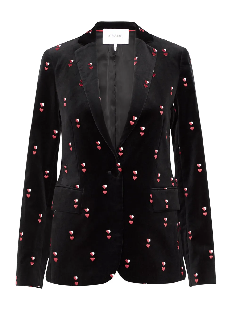 Evoke effortless chic ease with the Classic Blazer in Noir Multi by Frame Denim. Constructed in an ultra soft velvet feel cotton blend this charming classic blazer features a classic silhouette and collar lapel with a single button closure and is finished with a red and white heart pattern adding a hint of sweetness to any outfit.