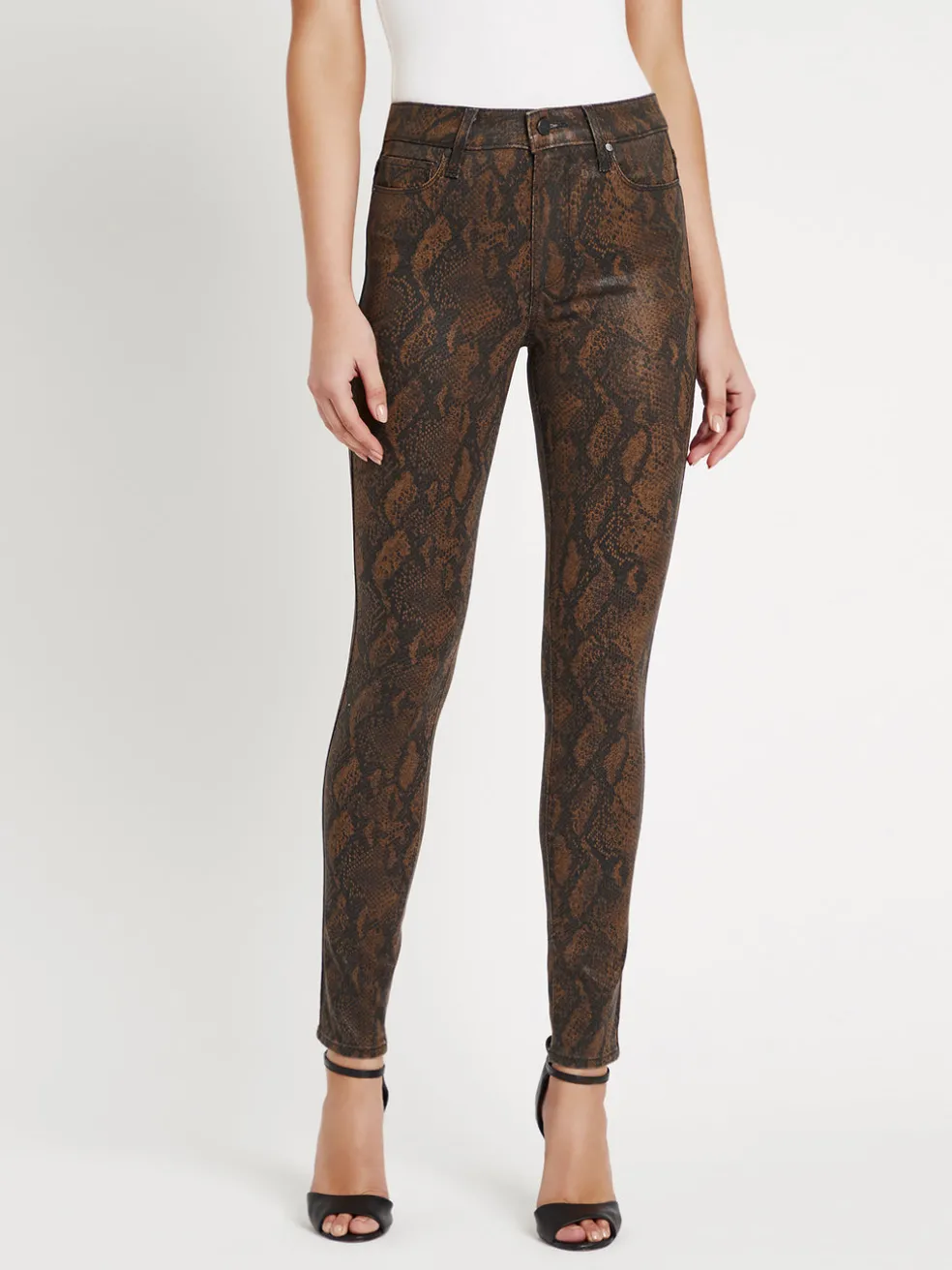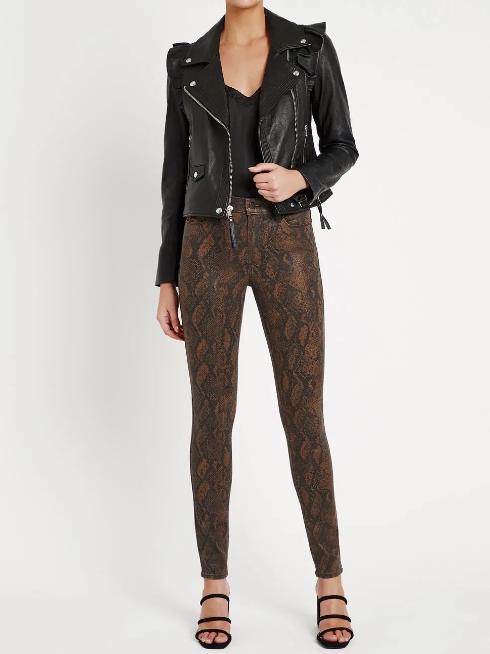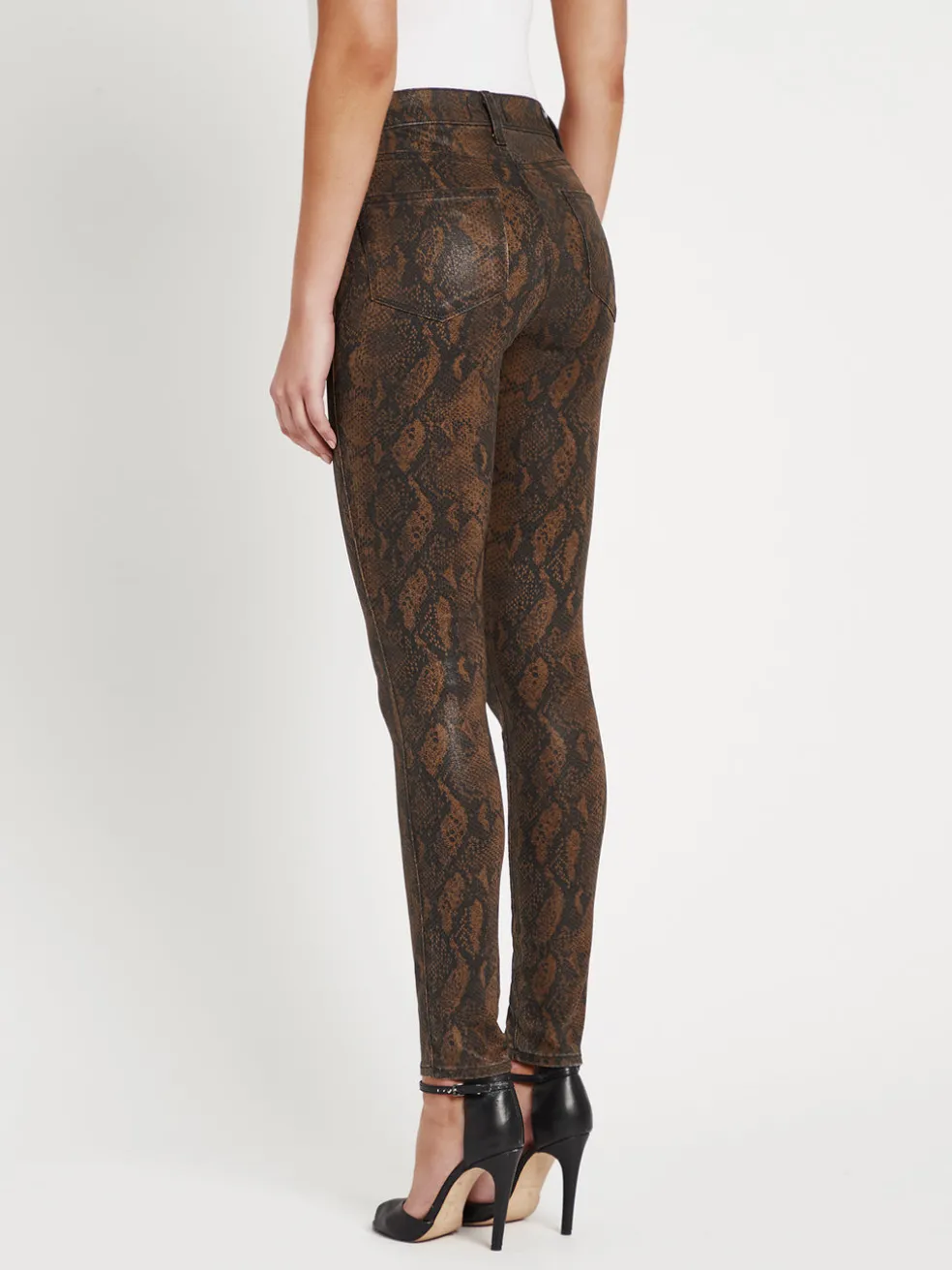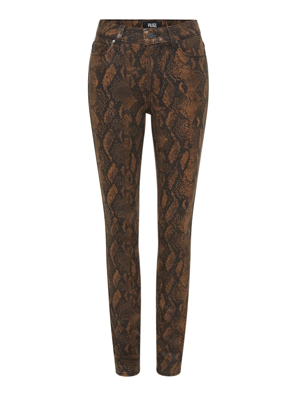 The Paige Coated Hoxton Ultra Skinny Jean in Brown Snake are the ultimate wardrobe statement refresher. These high rise skinny jeans feature a richly coloured brown snake print with leather look appeal. Finished with a 5 pocket design and sleek silver hardware these stylish high rise jeans can be paired back with an animal printed blouse and black denim jacket for the ultimate day to bar look.
