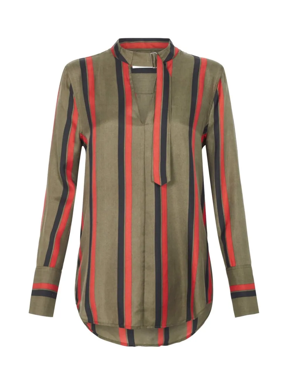 Coming here in the stunning colour herbal green with a red and navy stripe the Janelle Blouse in Herbal Green by Equipment is a transeasonal must have. Constructed from a lightweight silk this blouse features buttoned barrel cuffs, pleated back, curved hemline and a v neckline that if finished with a high neck buckle tie. Wear yours over black skinny jeans for an easy look that you can wear from the office to the cocktail bar.