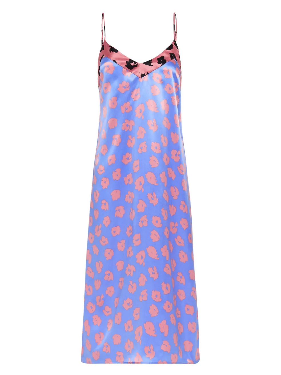 The Equipment Jules Slip dress in Sahara Sky / Apricot Rose is a classic chemise style in a luxurious silk satin fabrication. This pull over design features adjustable straps but no closures for the ultimate in comfort. A contrast panelling design in the black and pink floral along the V shaped neck line creates visual interest and a small slit on the hem seam allows for ease of movement.