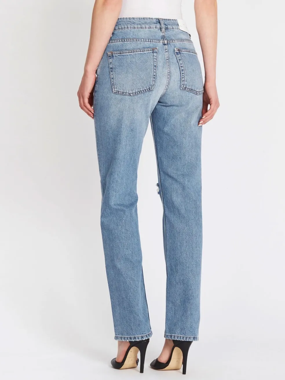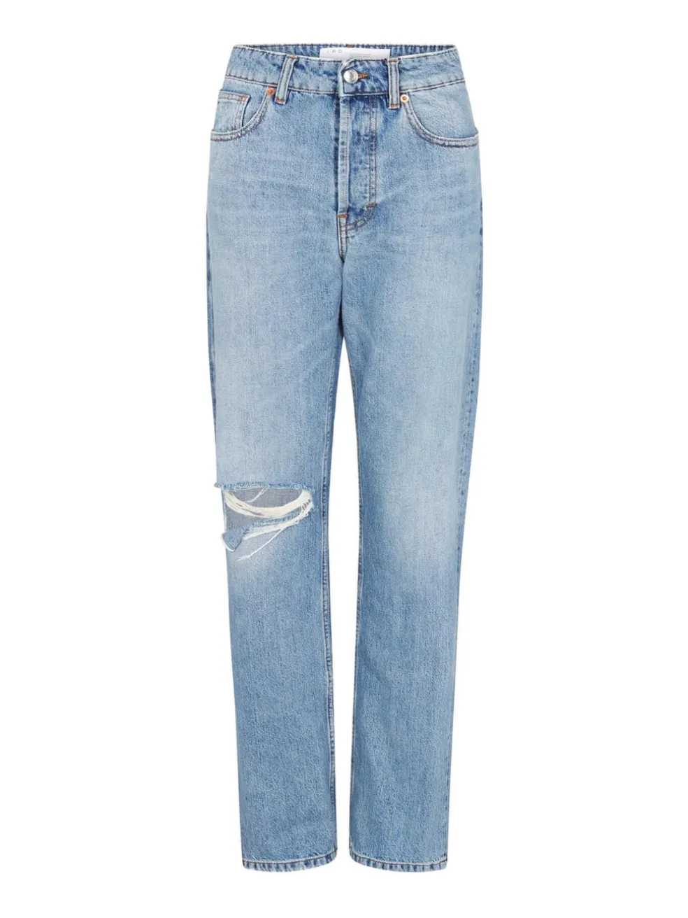 Here in Light Blue, IRO’s Ladyla Jean is a wide legged style with contrast stitching and copper rivets. Faded and whiskered, these jeans are detailed with a distressed rip at the right knee, shiny silver hardware and a high rise of 11 inches.