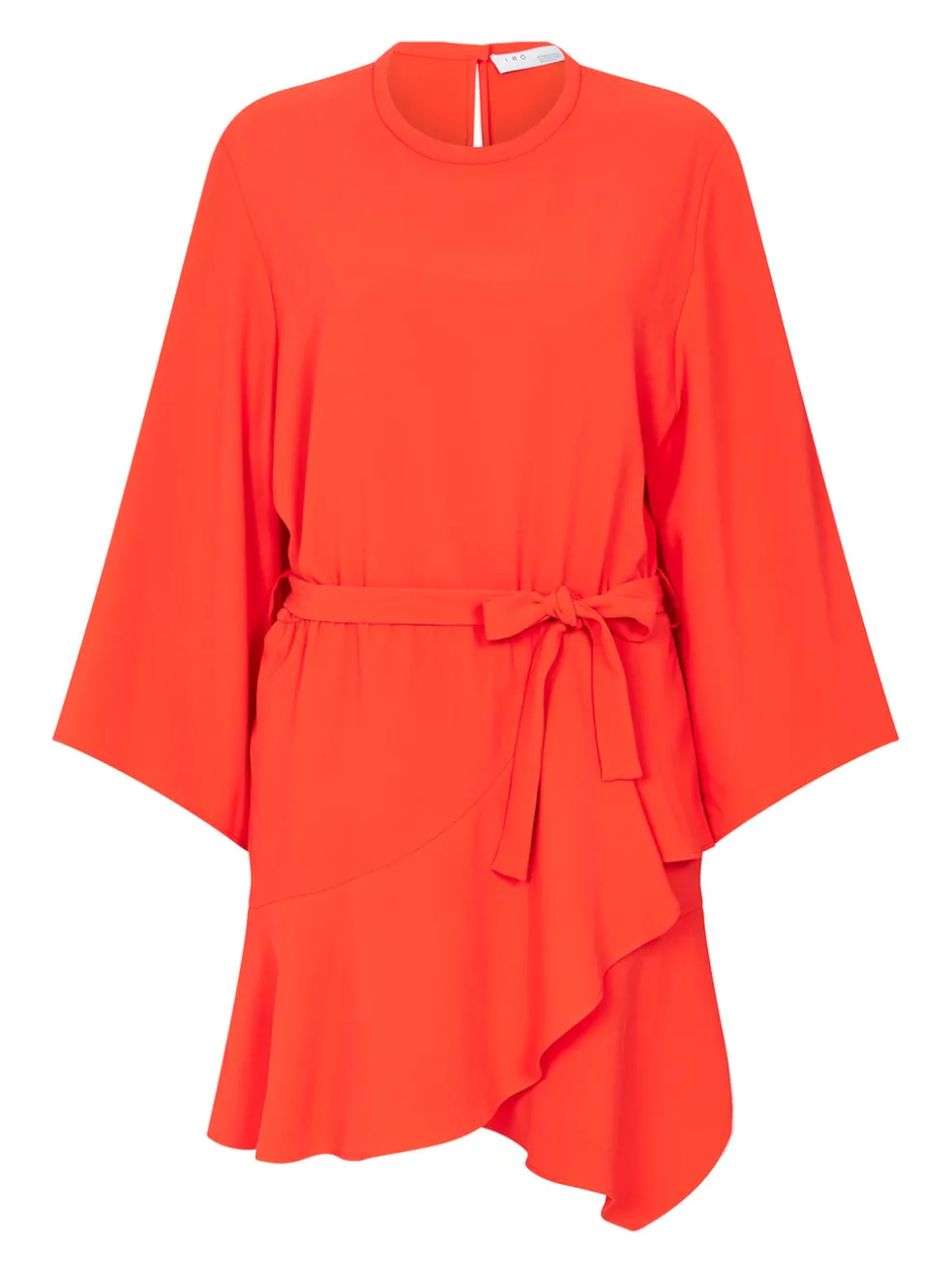 Turn heads in the bright and fiery IRO Layer Dress in Orange. Perfect for any occasion with its effortless drape, this dress is a stunning mid-length featuring a flattering waist tie and wide sleeves. With frill detailing and a high rounded neck, the Layer Dress would be flawlessly complimented by a simple black heel.