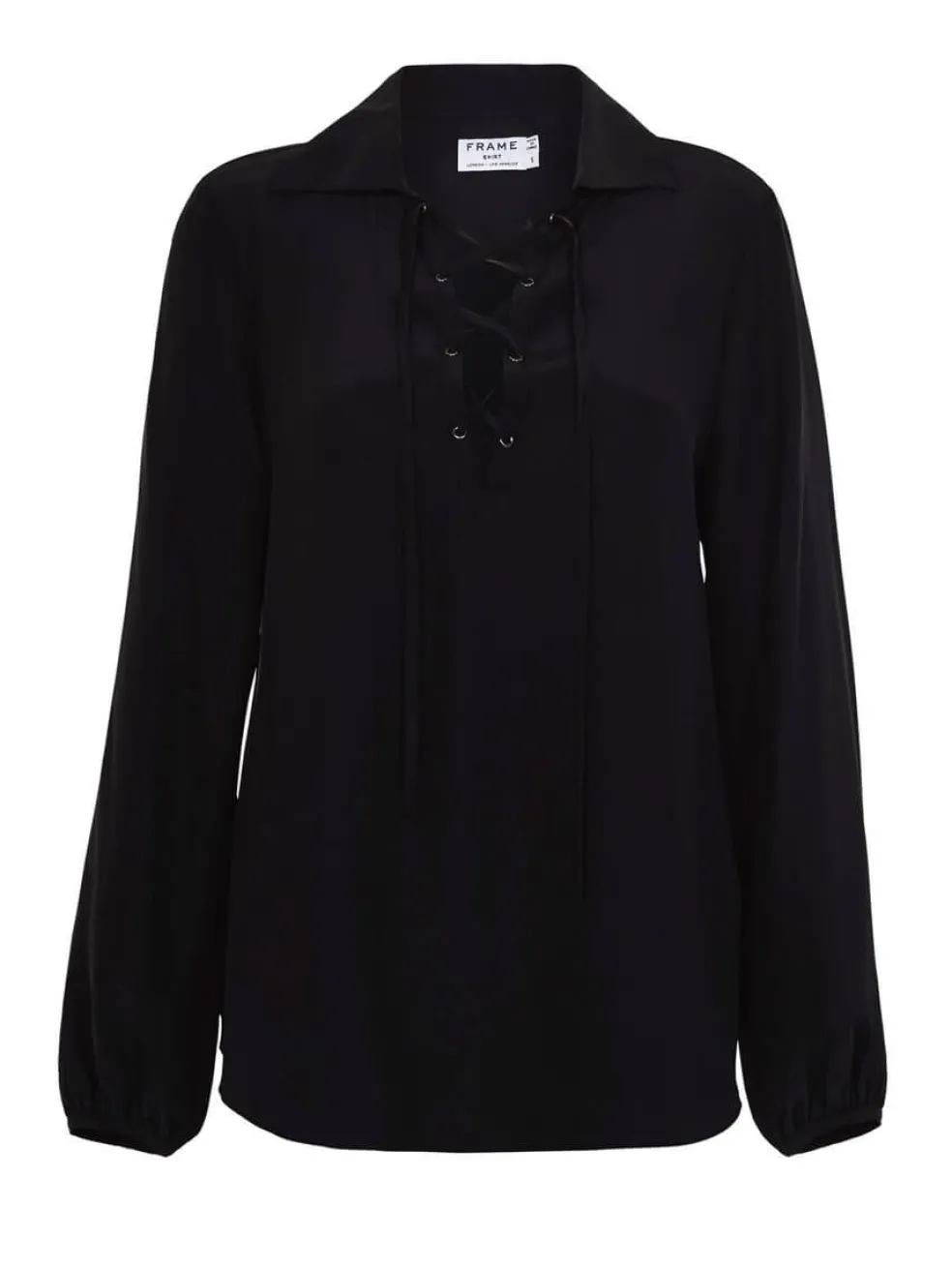 This floaty silk blouse from Frame Denim features a cross over lace up neckline with a classic shirt collar. The Le Lace Up Blouse features elasticised cuffed sleeves and a curved hem.