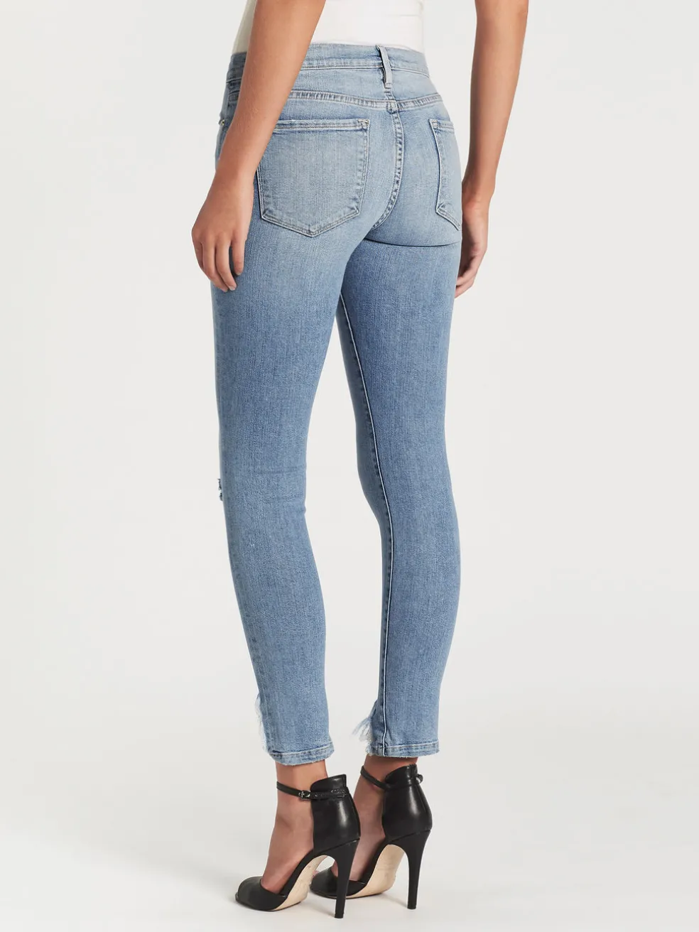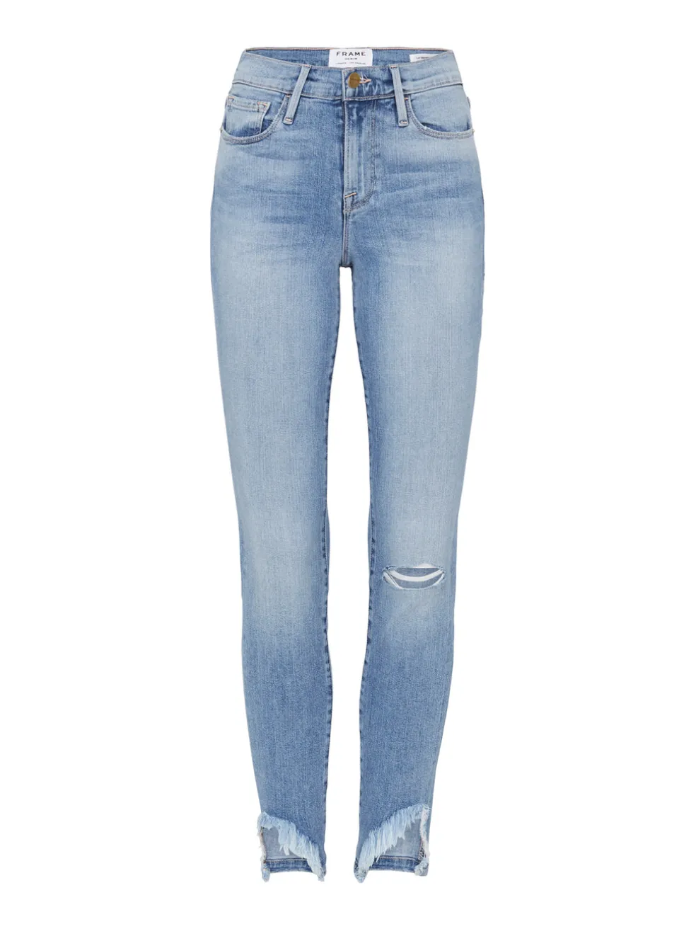 Strut your stuff in The Le Skinny De Jean in Scampi from Frame Denim. Constructed from a cotton blend stretch fabric these light denim jeans are a skinny fit and feature a single button zip fly closure with gold hardware, subtle fading through the leg, front and back pockets and are finished with knee rip detail and a distressed hem. The perfect jean to pair with your favourite tee and just slay all day.