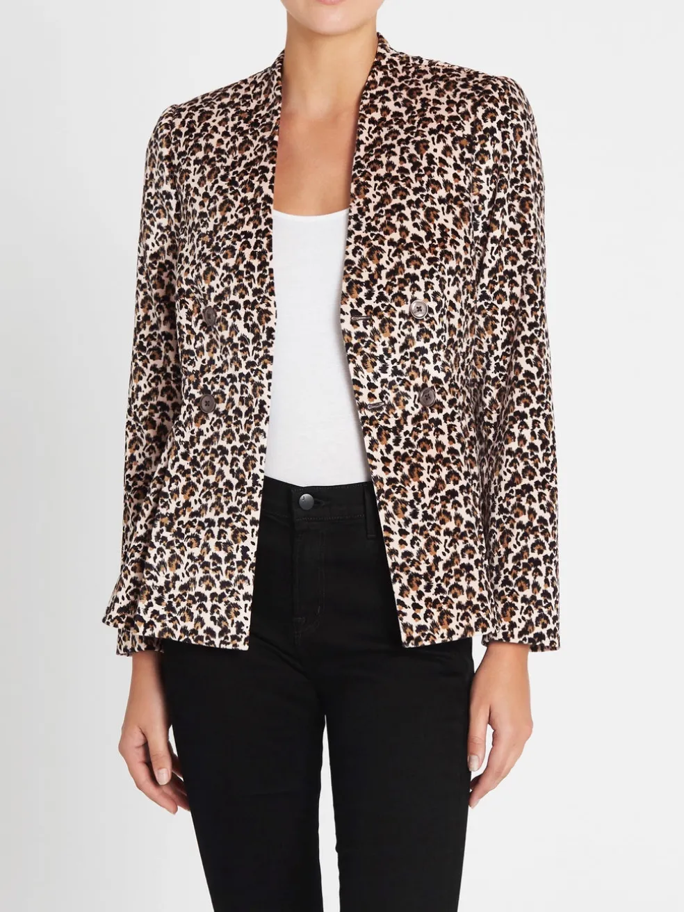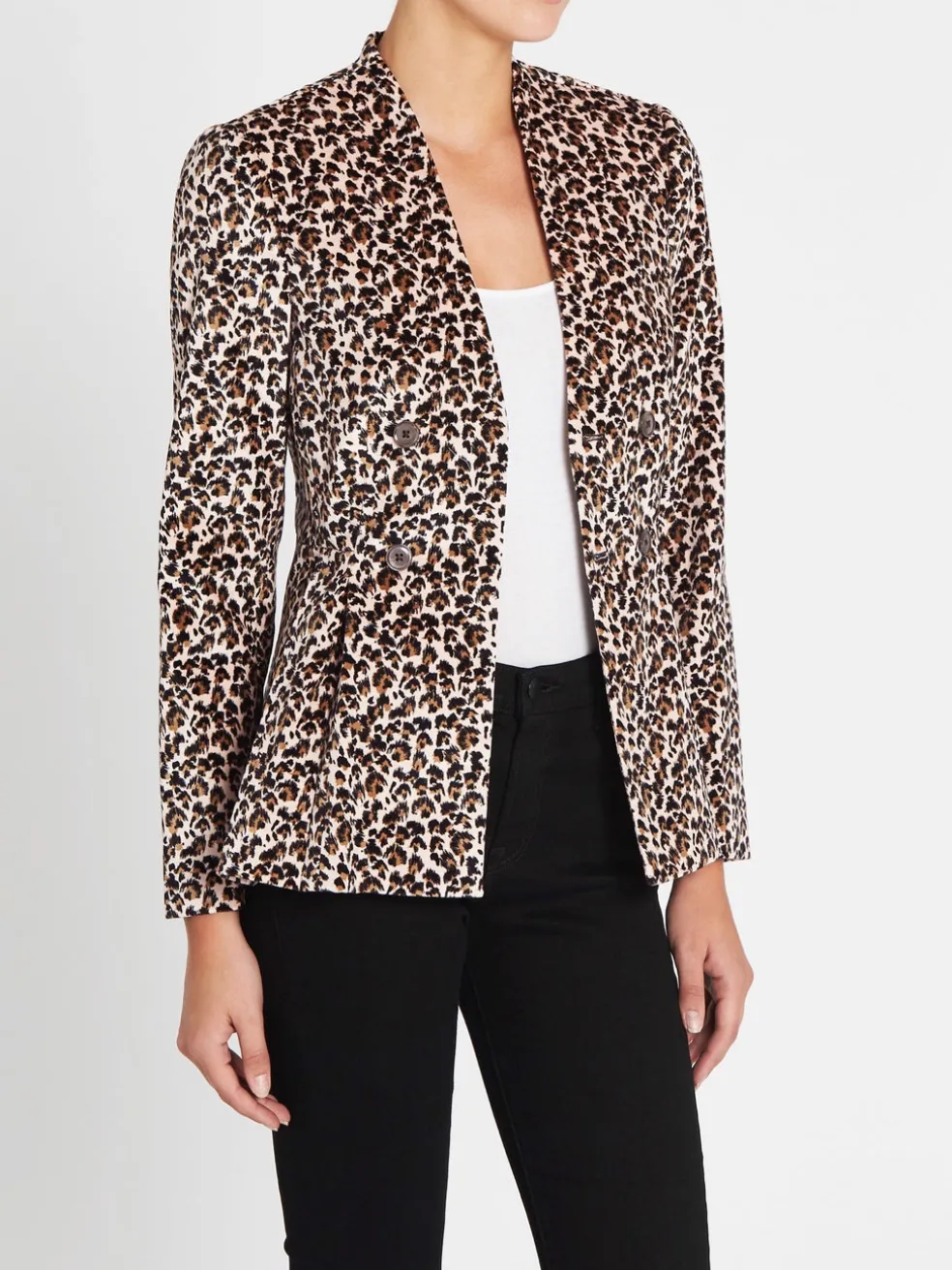 Add some leopard print to your life with the Rebecca Taylor Leopard Print Velveteen Jacket in Caramel Combo. Constructed from a cotton blend fabric this collarless piece features padded shoulders, long sleeves, a centre front button opening and pleated detailing at extending to the hem.