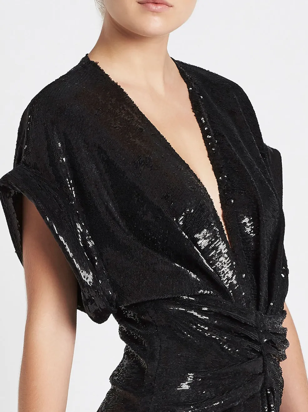 The Lilou Dress in Black is the perfect party dress for those nights out with the girls. Crafted from rayon this short sleeved sequinned mini dress features a deep V-neck drop, centre front pin tucks and waist draped detailing. With an invisible side seam zip closure wear this dress with your favourite strappy heels and dance the night away.