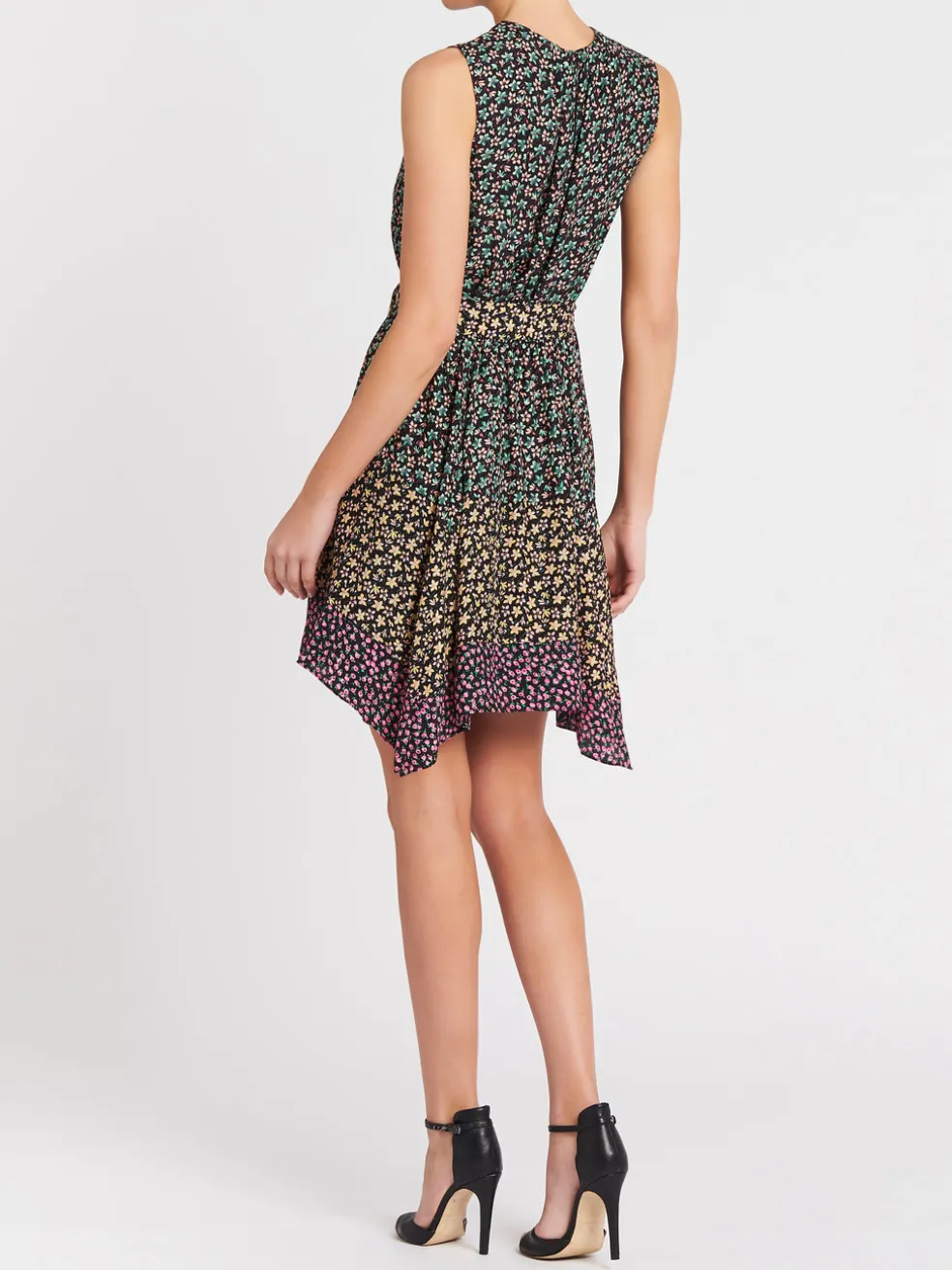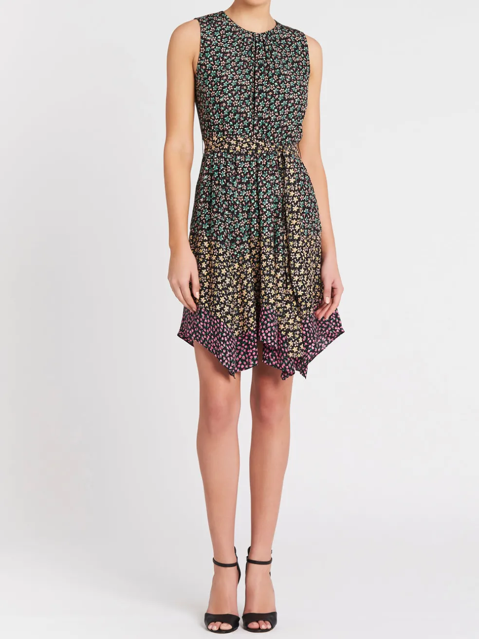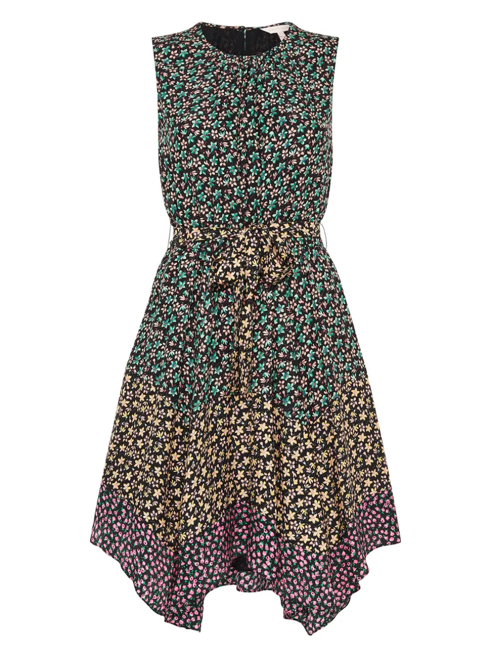 Fresh floral meet colour blocking with the Rebecca Taylor Louisa Floral Mixed Dress in Print Mix Combo. Constructed from a stunning floral printed silk this sleeveless dress features a round neckline, handkerchief hem and is finished with a self tie belt to cinch the waist and complete the look.