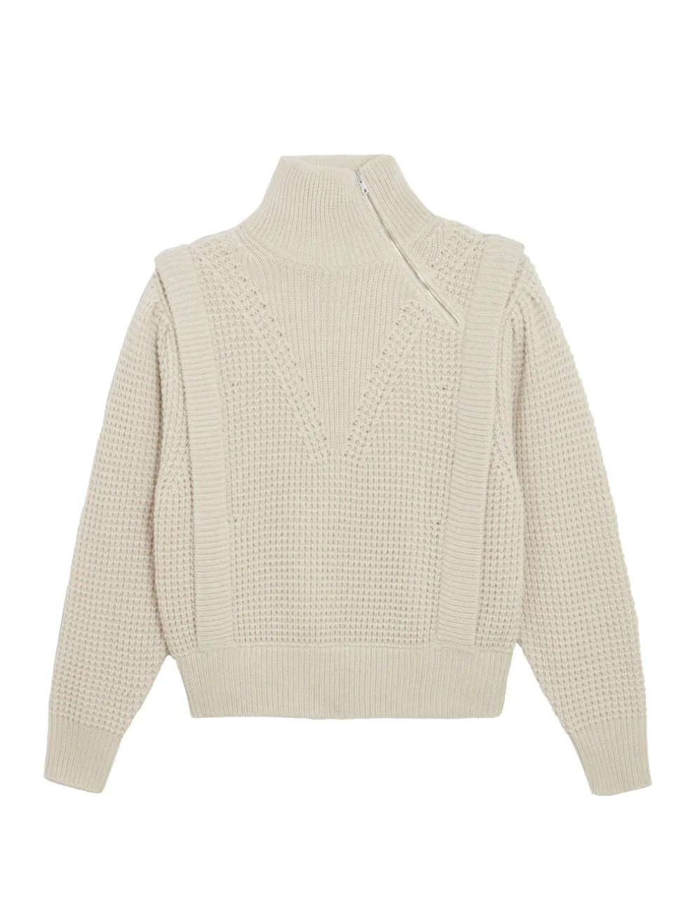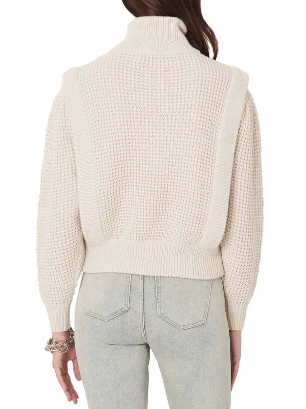The IRO Macky Sweater in Cream is a dreamy wardrobe addition. Beautifully constructed in a waffle texture with a high neckline with asymmetrical zip closure, ribbed trims and statement shoulders. Perfect paired with some tight leather leggings or your fave distressed boyfriend jeans.