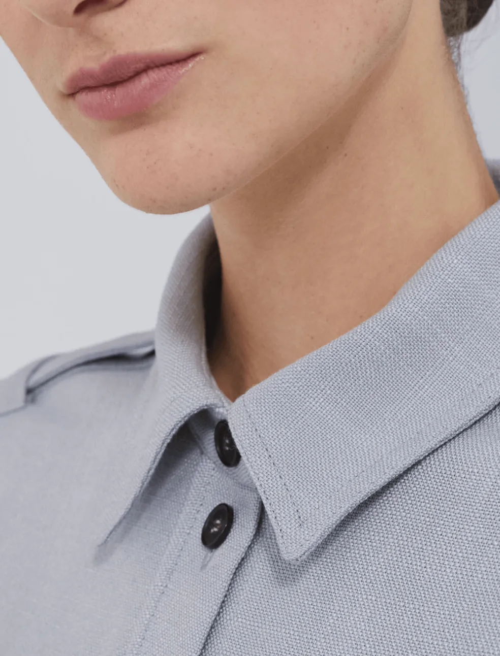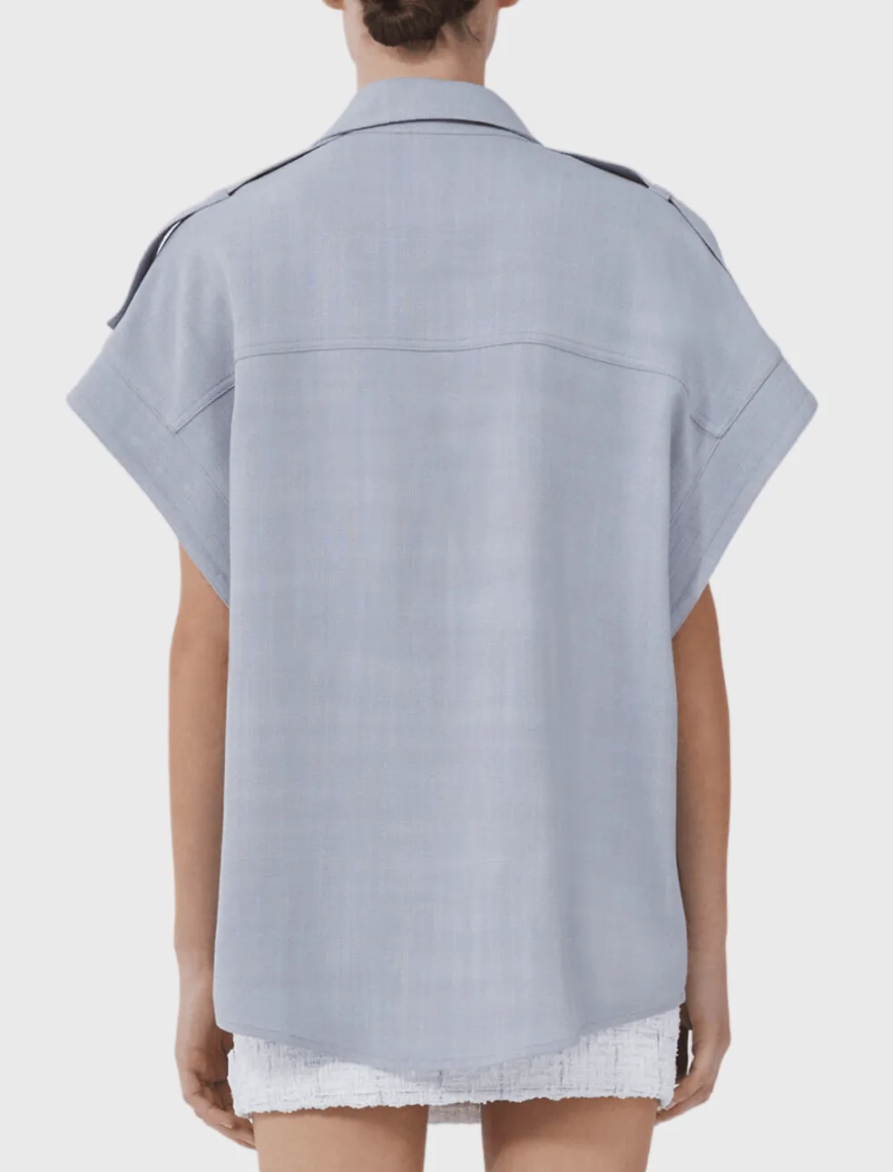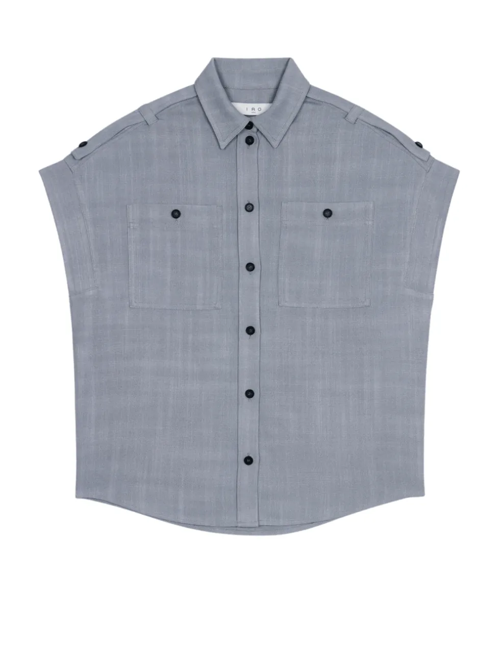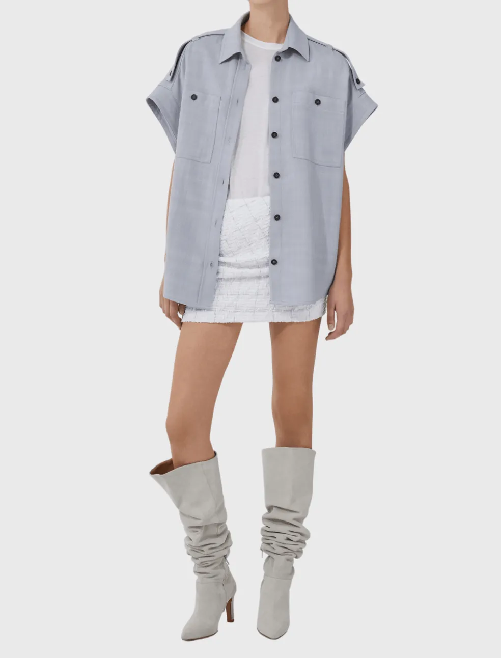 This utilitarian style overtop is a great layering piece in a lightweight breathable fabric. The cap sleeve shacket is perfect for transseasonal weather, layer it over a long sleeved t-shirt or wear on it’s own. Featuring shoulder epaulette detail, matte black buttons and twin flat stitch front breast pockets. Complete the look by pairing it will the IRO Miels Pant.