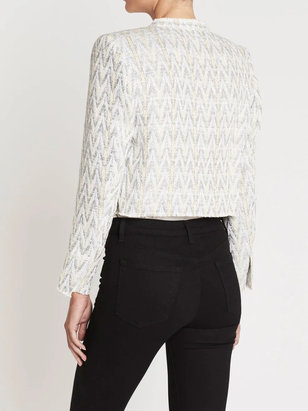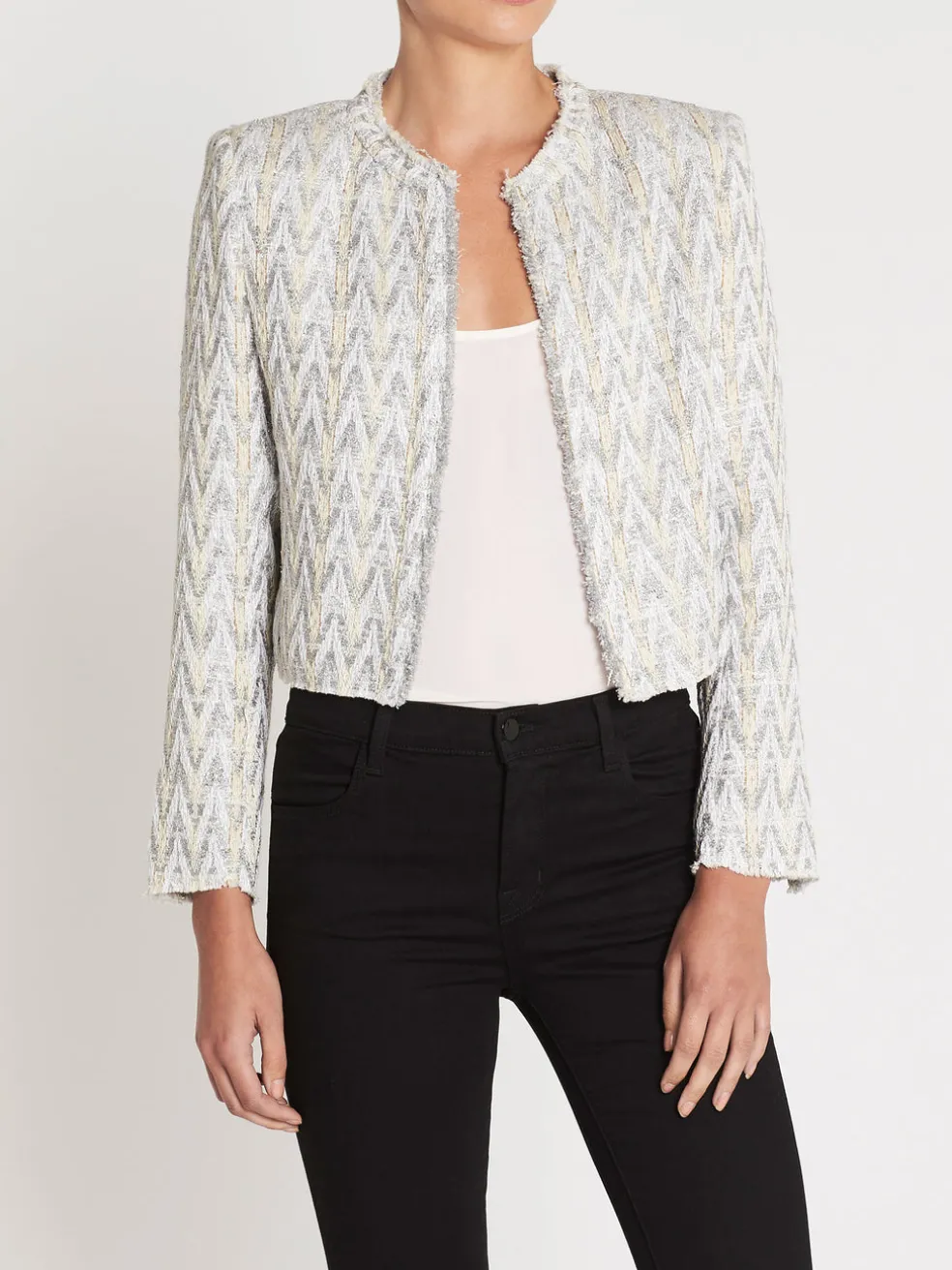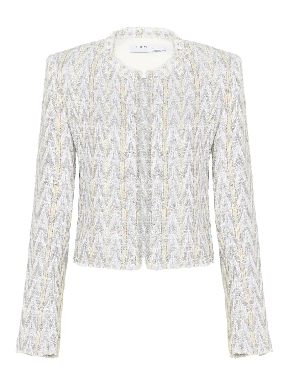 Add a little more Glam to your outfit with the IRO Makilo Jacket in Grey. Constructed from a Cotton Polyester blend, this blazer features a dazzling zig zag shimmer with round neckline and opened front finished with raw details to the neckline, hemline and cuff.
