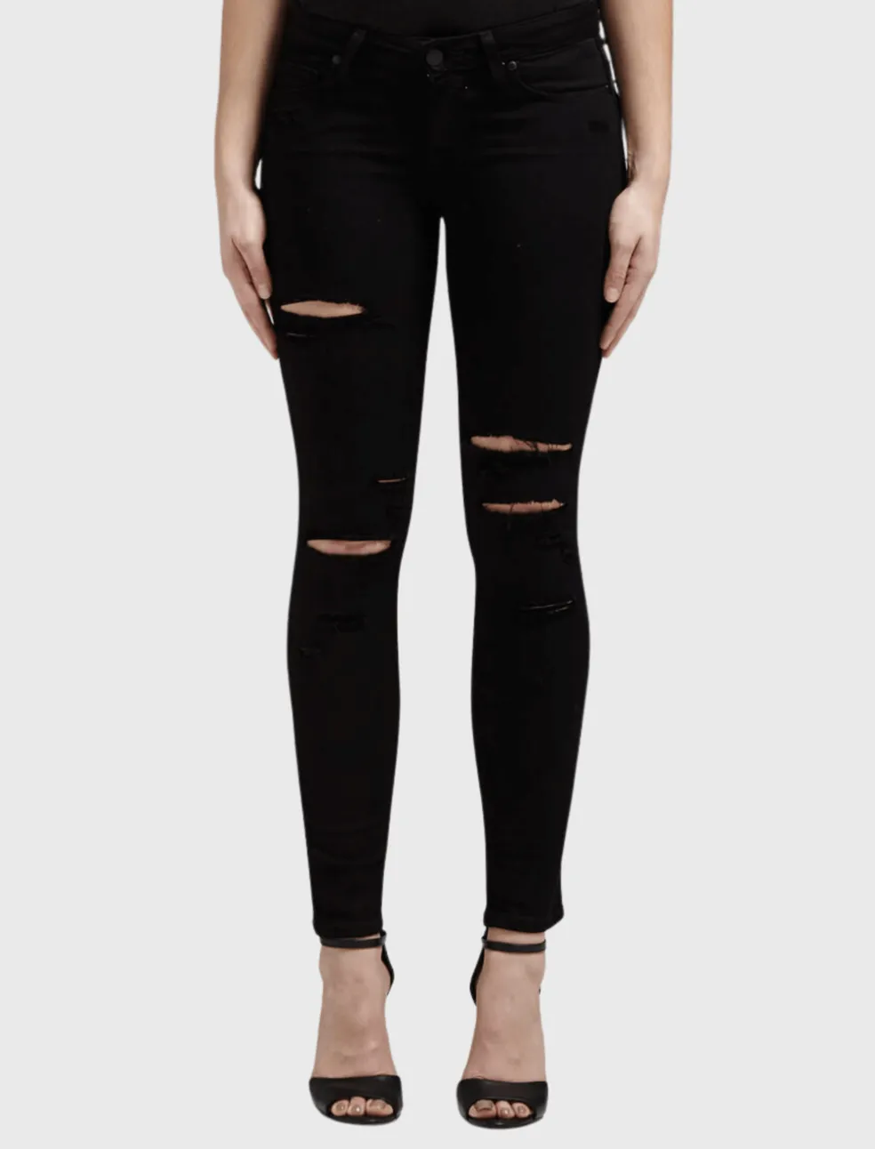 The Verdugo Arlo Destructed Jean by Paige are a super soft black wash, and have destruction along the thighs and knees. With a low rise of 8 inches and accented by stylish matte black hardware, these jeans are just the right amount of rock and roll.