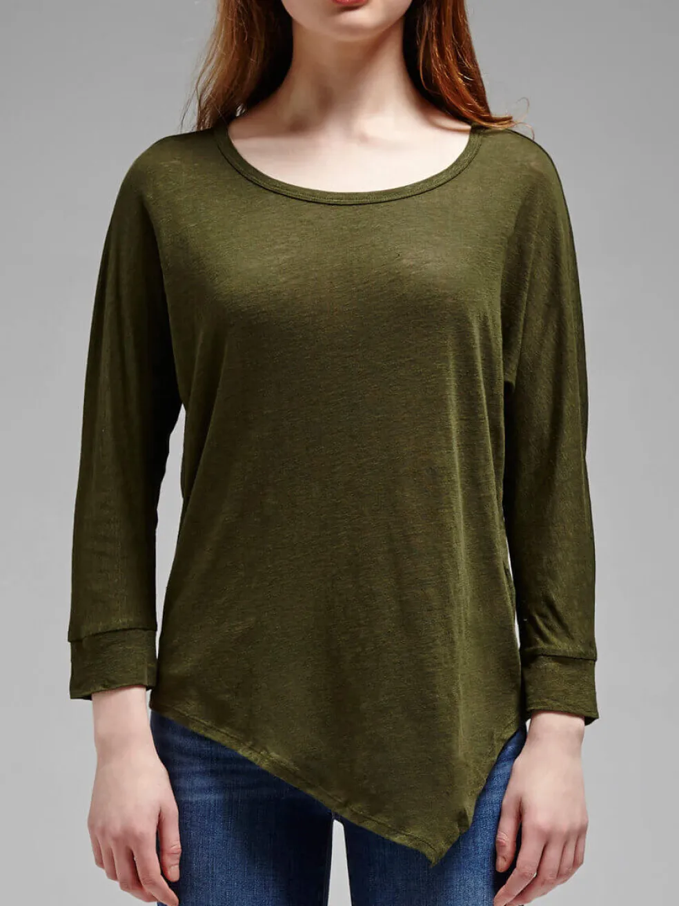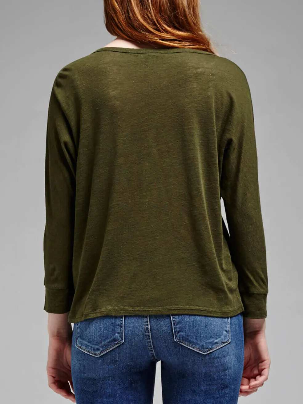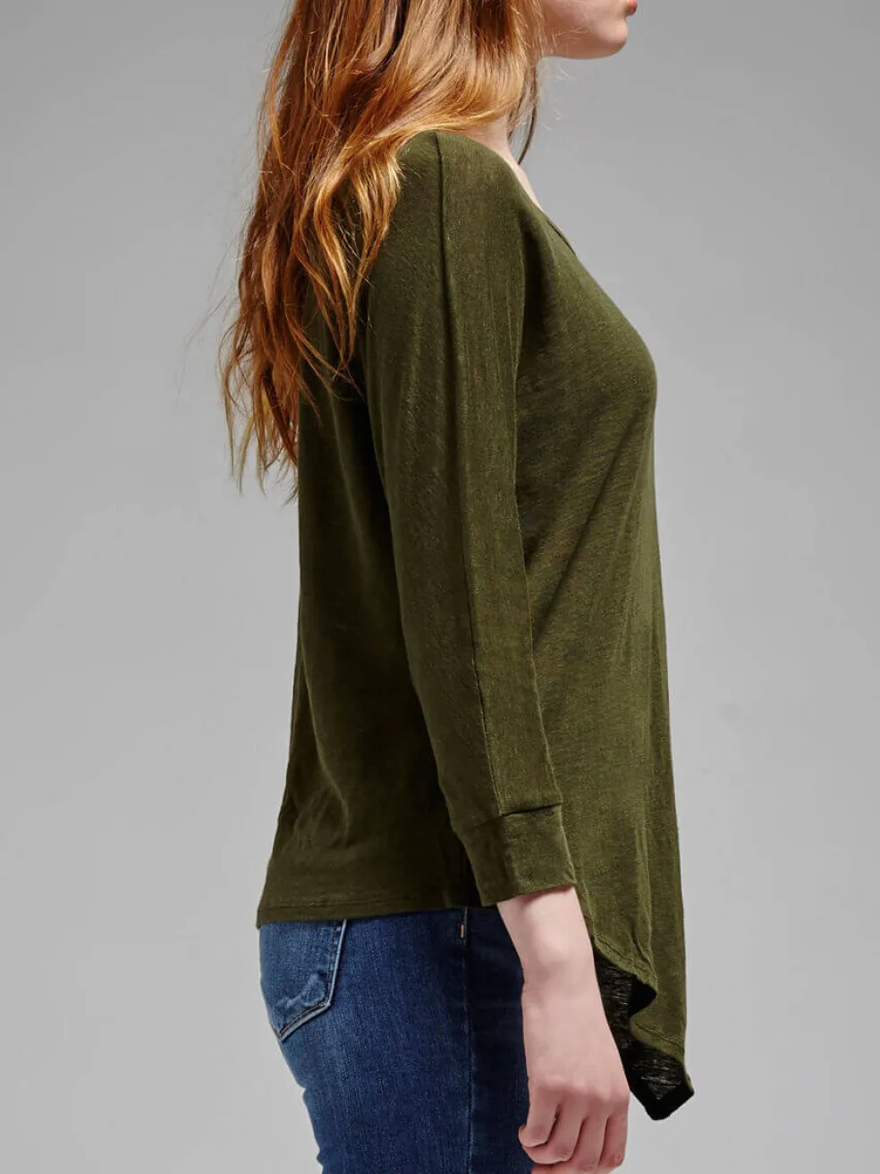 The Marvette Top from Joie is a lightweight linen top, and comes in a deep military green colour. It features a boat neck, 3/4 length sleeves, and an asymmetrical hem.