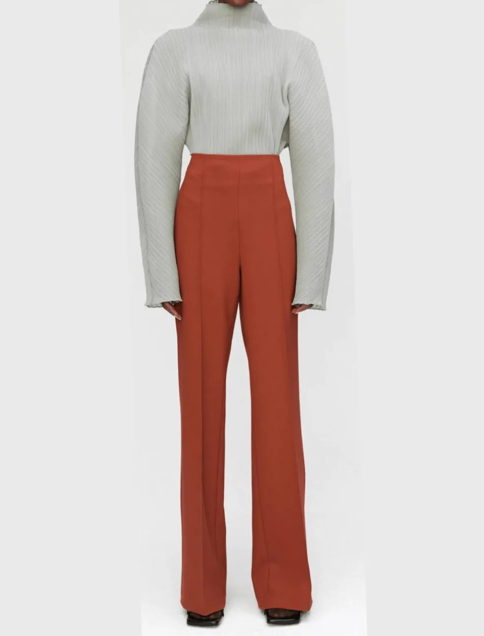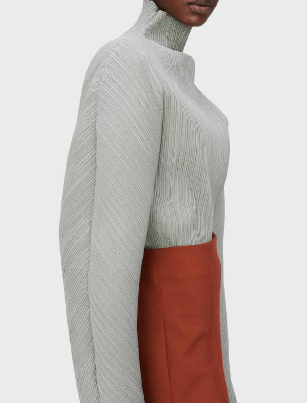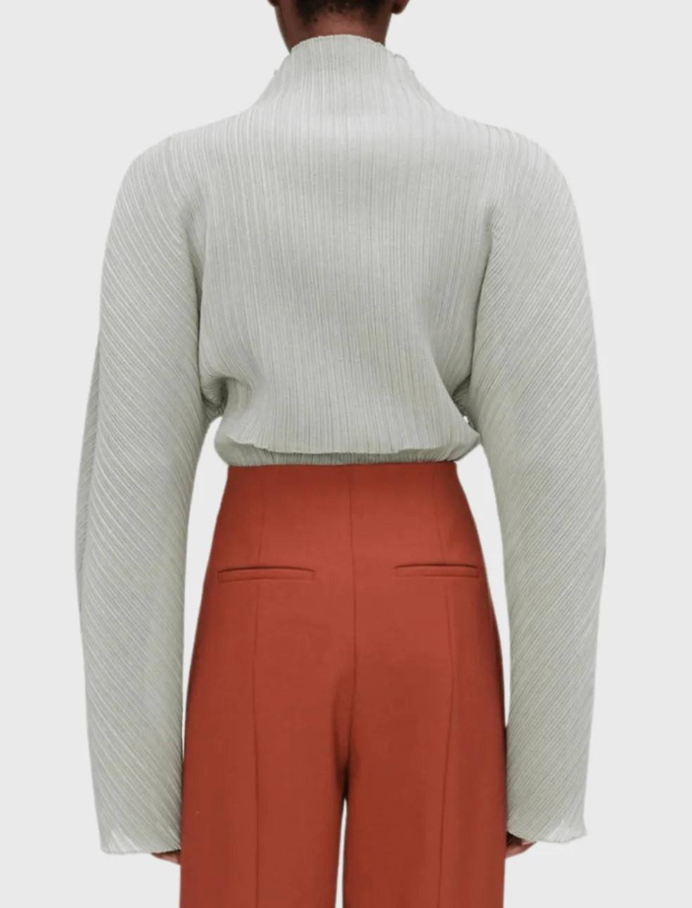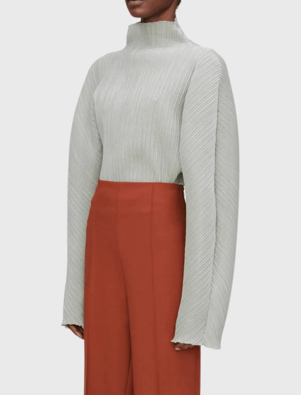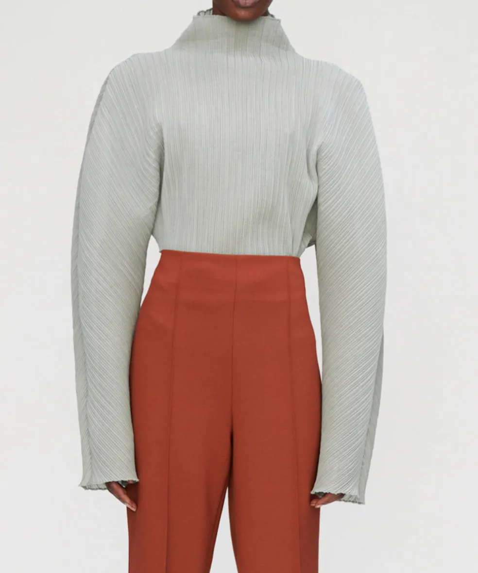Embrace statement dressing in the Megan Plisse top from Róhe. This fashion forward piece is made from a technical Japanese fabric and is sure to take your outfit to the next level. This stunning sculptural long sleeved blouse comes here in the colour Pastis – a romantic dusty mint green. Perfect for a night out – pair back with black leather pants for a serious rock star glam or go more subtle by matching with some wide leg light blue denim. Semi sheer.