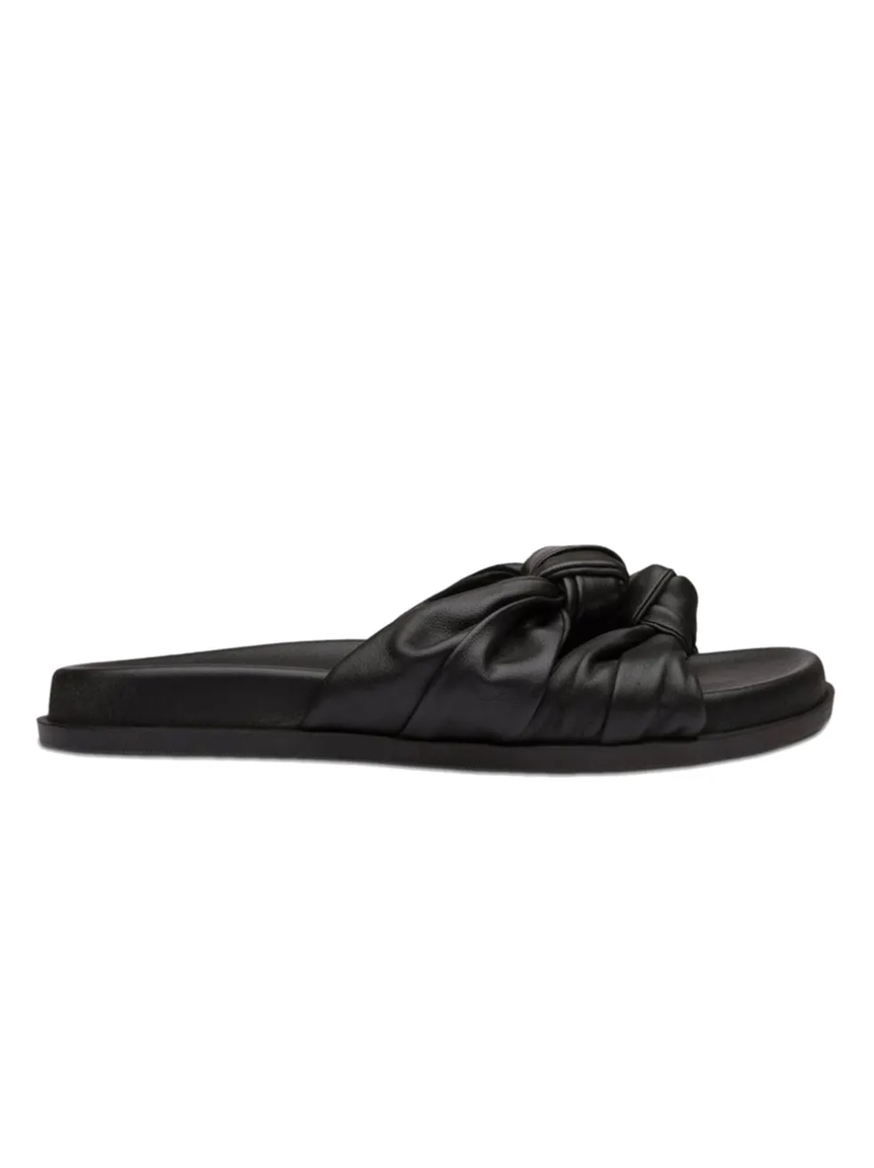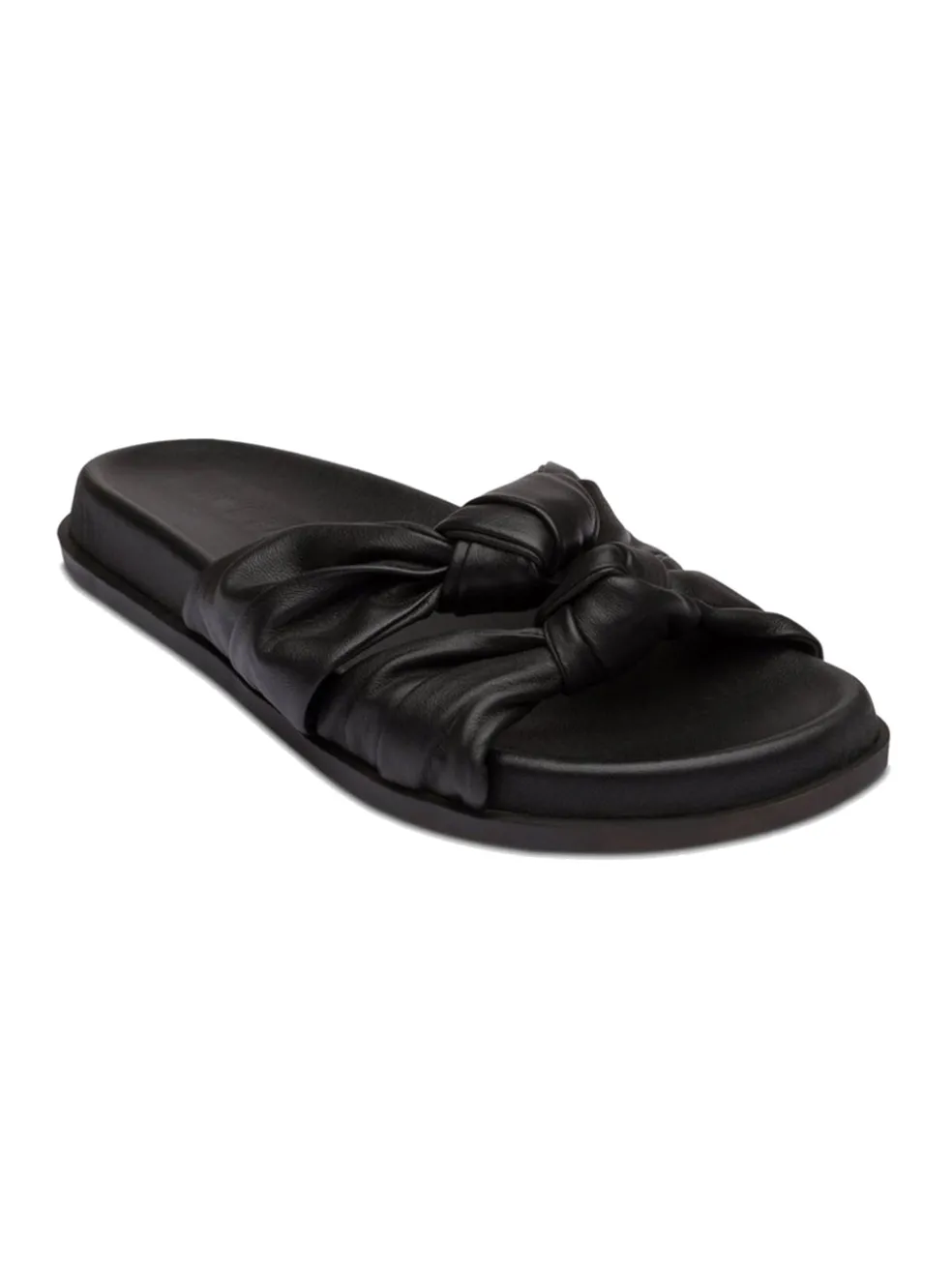 The Sol Sana Memphis slide in Black features a gently rounded toe and deep sole with an open back for a relaxed and sleek summer design. Two thick straps of butter soft black leather twist together to create gentle ruching and an elegant knot detail on the top of the foot.