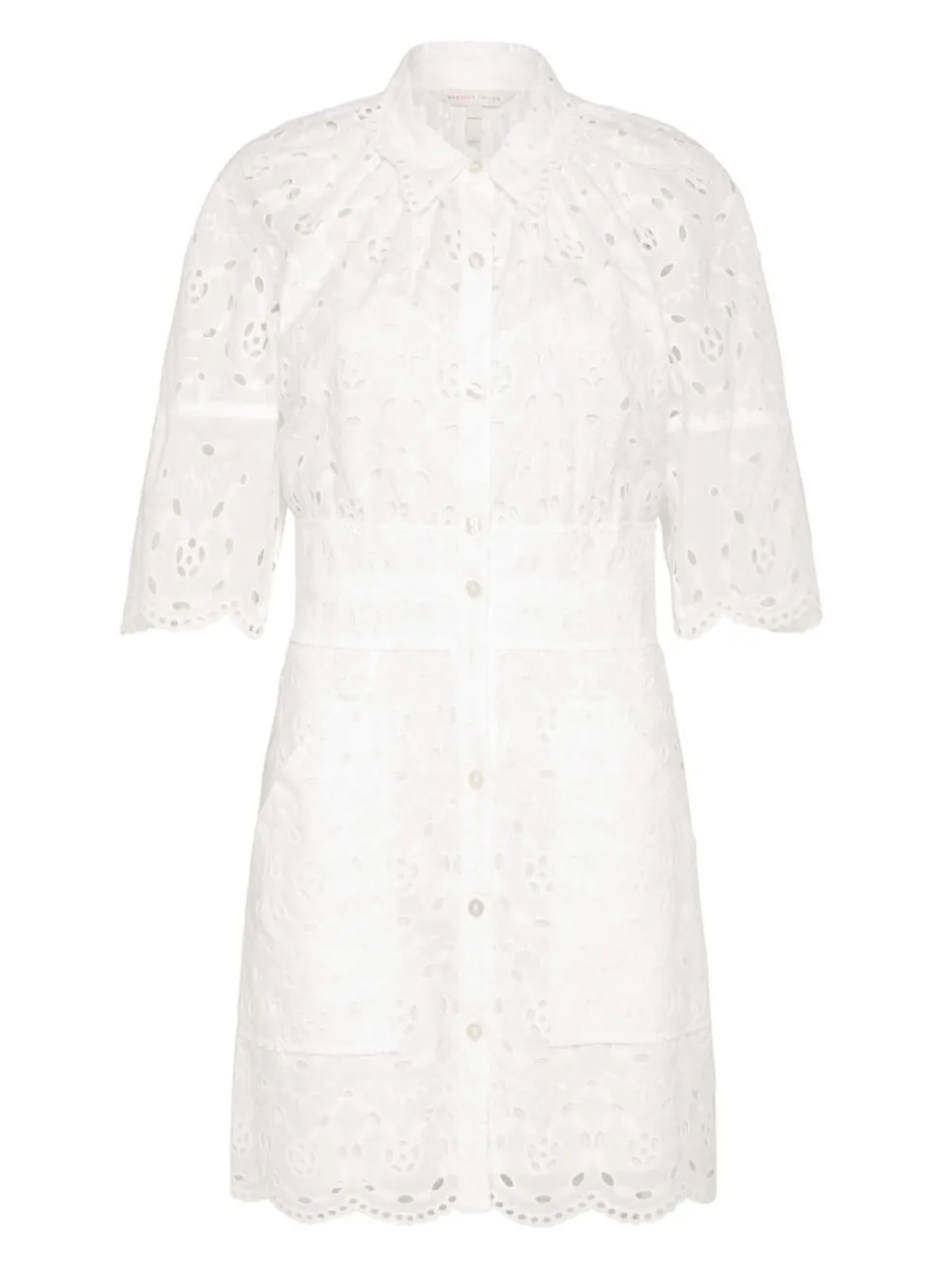 Infuse la femme chic in the Mina Eyelet Dress in Milk by Rebecca Taylor. Constructed from Rebecca Taylors custom developed floral embroidery, this mini short sleeved dress features a fresh floral embroidered eyelet, designed with fresh scalloped edged voluminous sleeves, a classic shirting collar, and finished with a panel waist band design to nip in the waist and duel panel pockets for all your essentials. Pairs perfectly with a summer slide, heel, boot or sneaker!