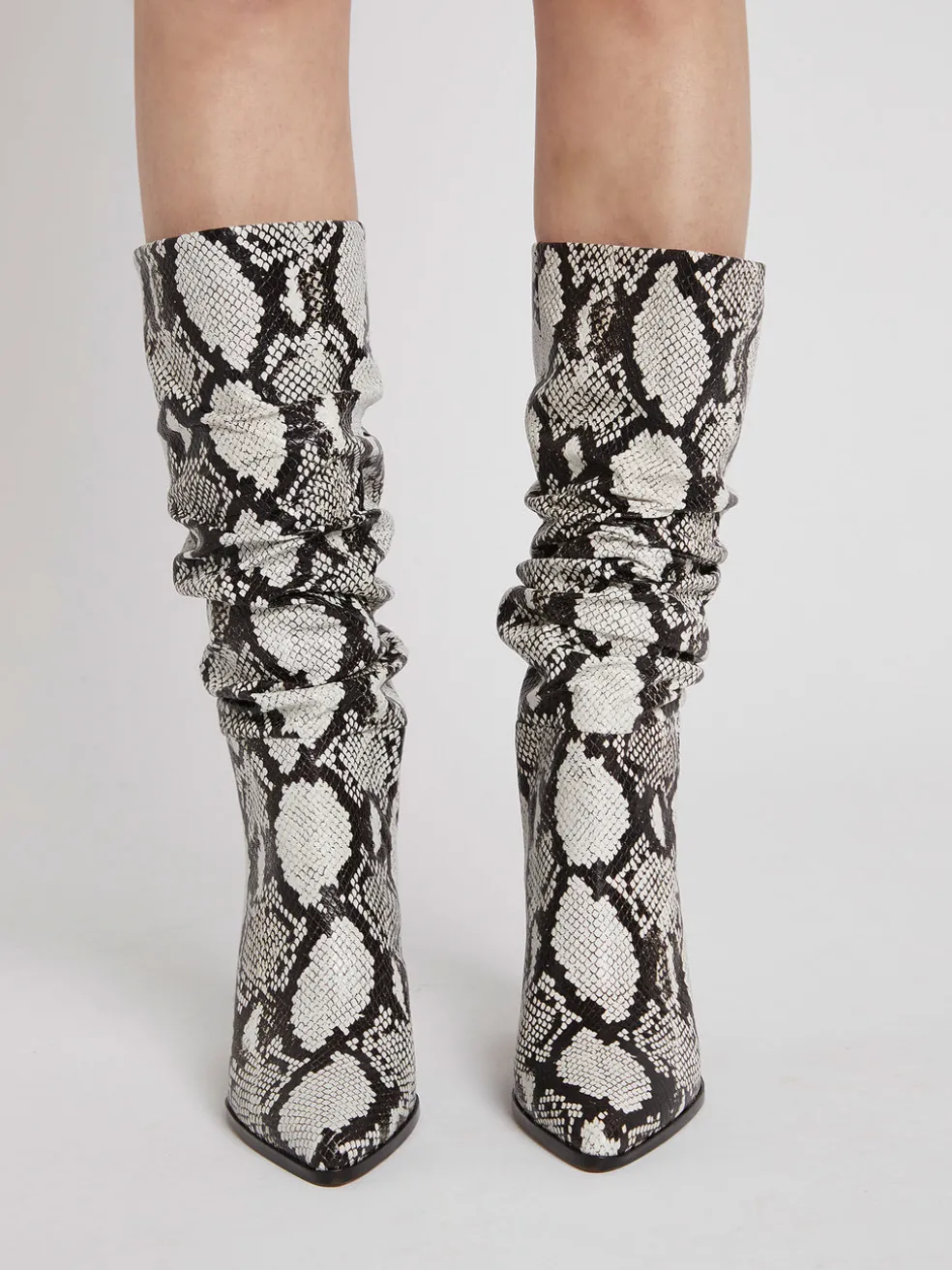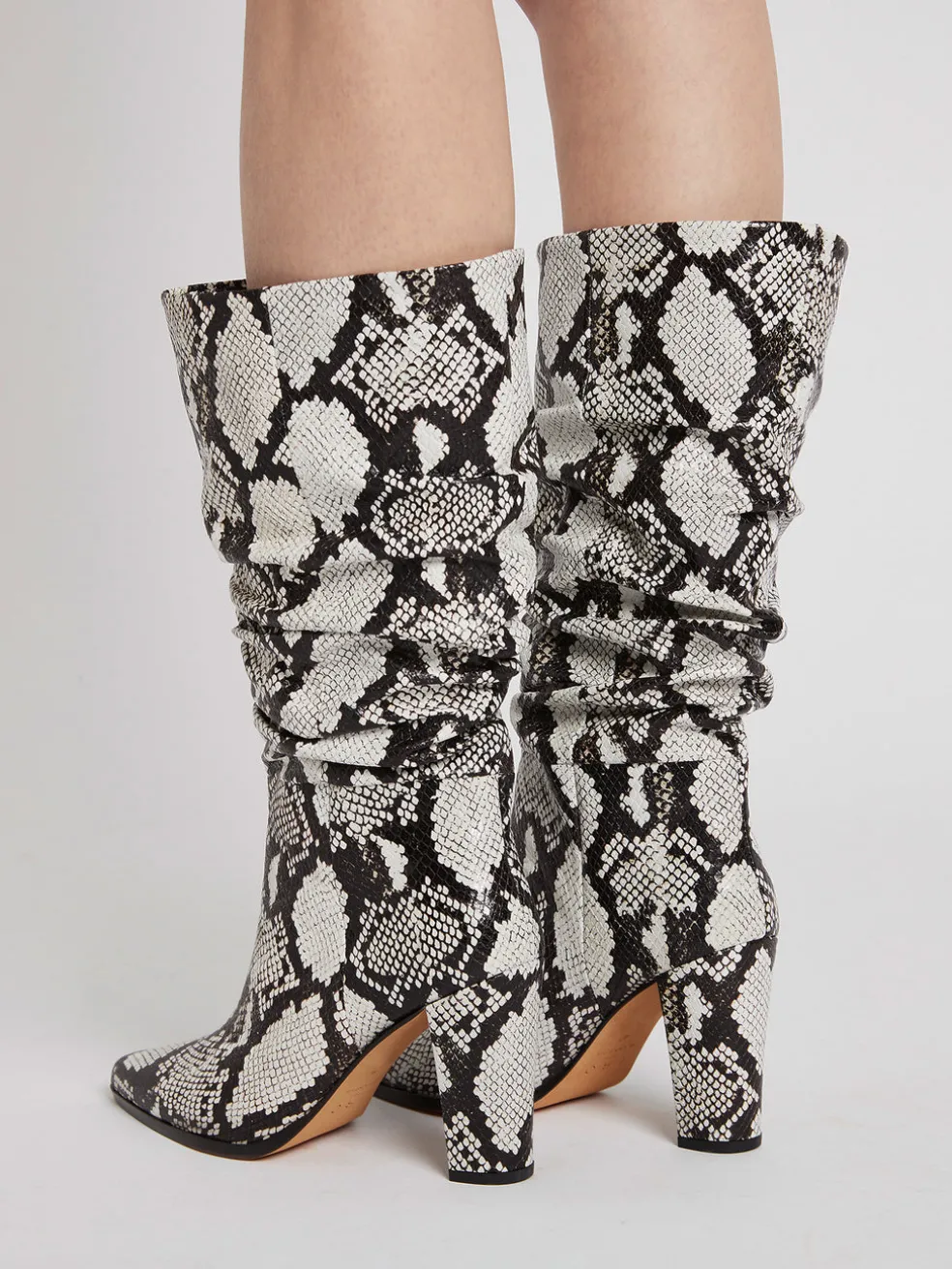 Step in style with the IRO Paris Nagy Boot in Black and White. These show stopping boots feature a 3.7 inch block heel, pointed toe, scrunched finish and are designed to finish just below the knee. Wear with leather leggings and a white flowy blouse for ultimate night out style