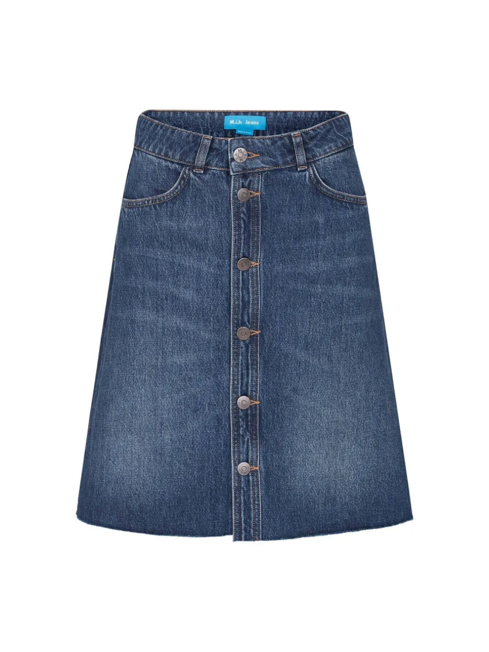 The M.I.H Jeans Nova Skirt is a stylish take on the much loved a-line skirt. Constructed from a classic blue denim with natural wear this button down skirt features simple scope pockets, a raw cut him and is finished with silver hardware.
