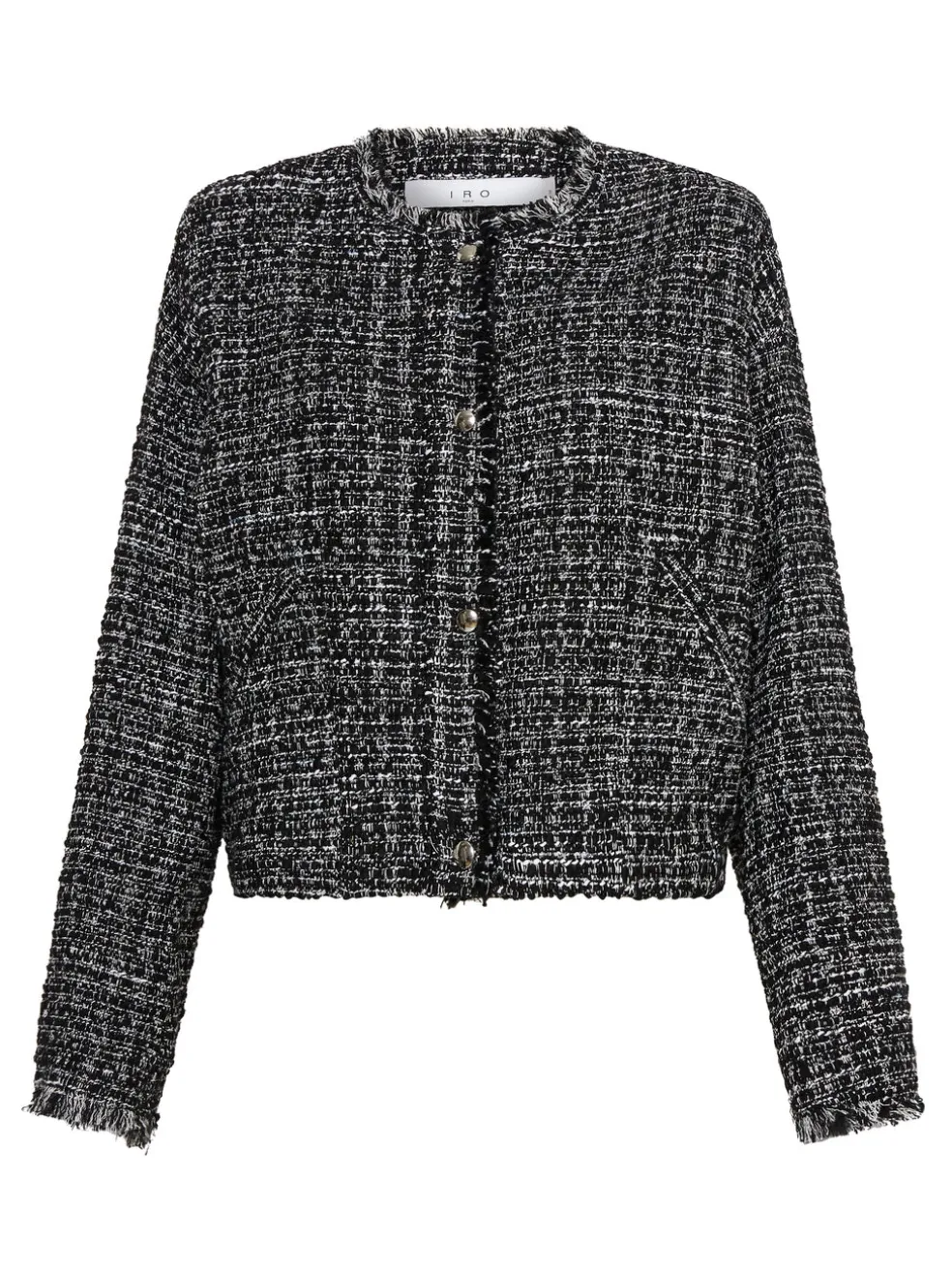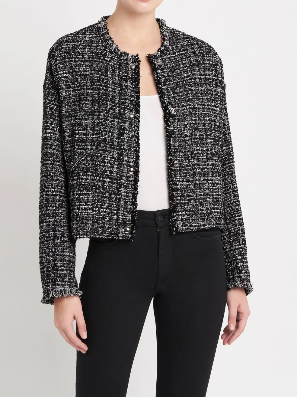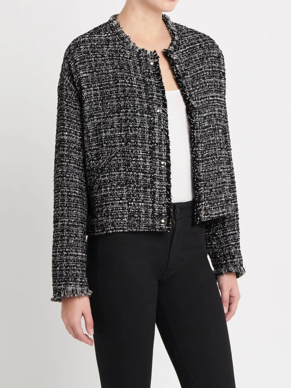 A baby tweed bomber jacket with a frayed neck line and shining silver snap buttons will quickly become your go to jacket. The IRO Oluna Jacket in Black and White is an unlined woven jacket with a pinched back and raw hemmed sleeve detail.