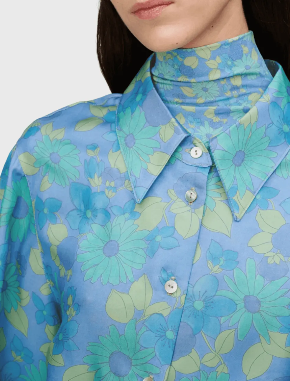 Embrace the bohemian vibes inspired by this pretty oversized floral shirt. The Overszied Luccio Shirt from Róhe features large cuffs, 70’s inspired pointed collar and is made froma silky organza fabrication. This retro style is complimented by a whismical watercolor flower print. A perfect button up for day to night dressing, pair with denim and sandals for a classic relaxed style or with suit pants and ankle boots as a chic work option.