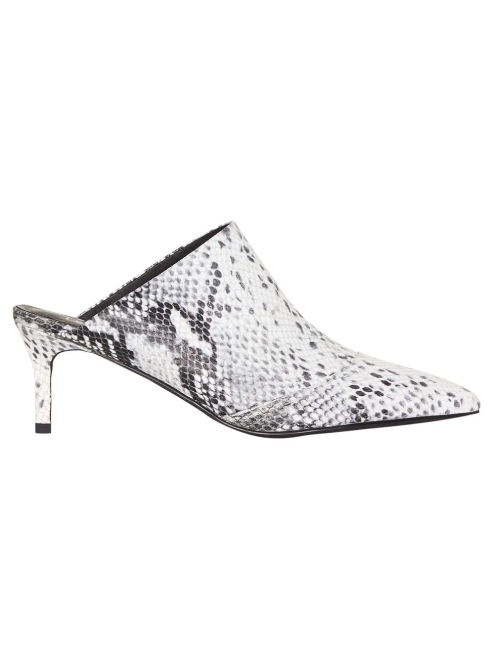 Walk this way to the Sol Sana Perri Mule in Black and White Snake. Constructed in a stunning snake skin inspired leather these pointed mules feature an open back finished with a subtle kitten heel.