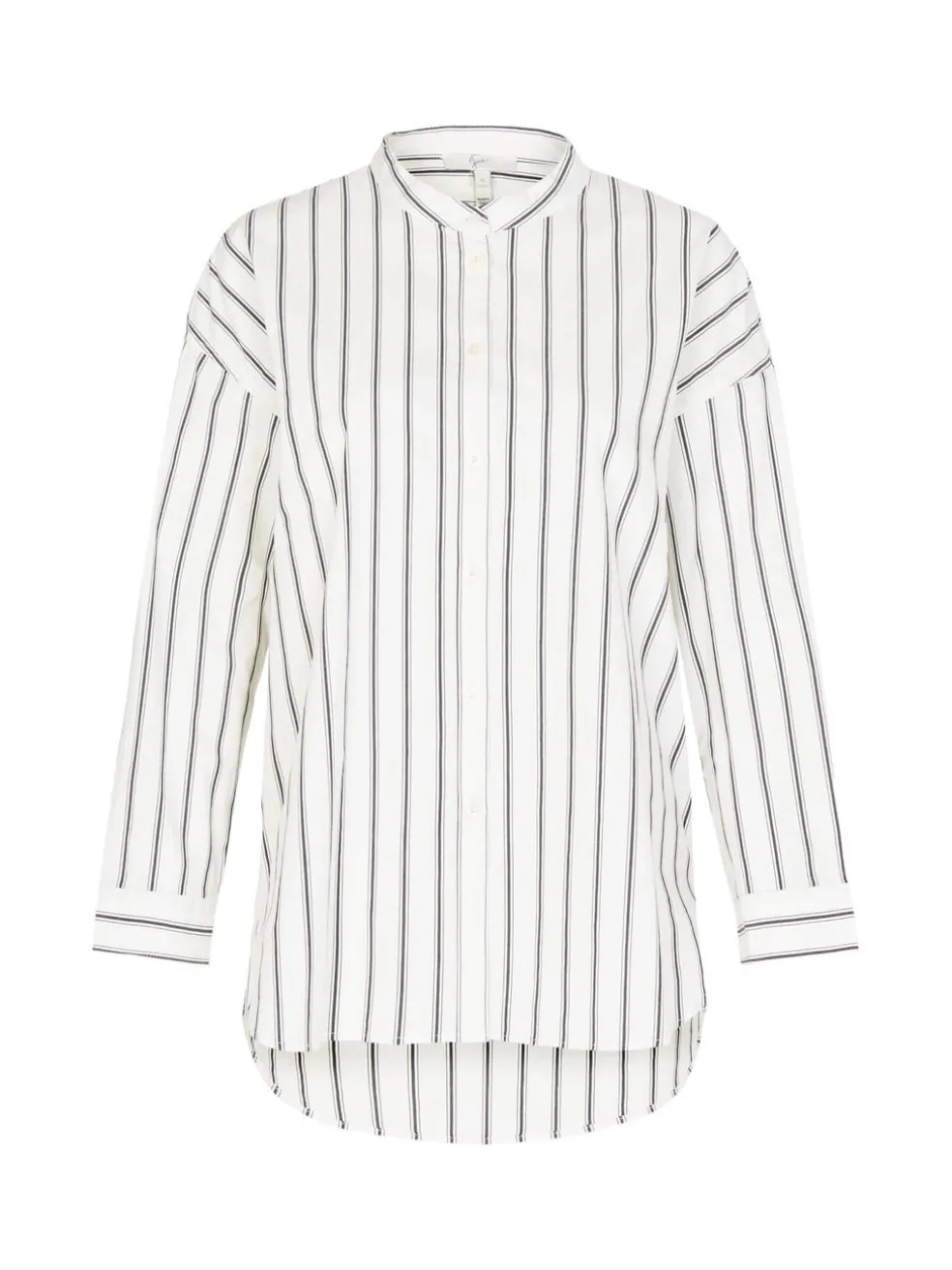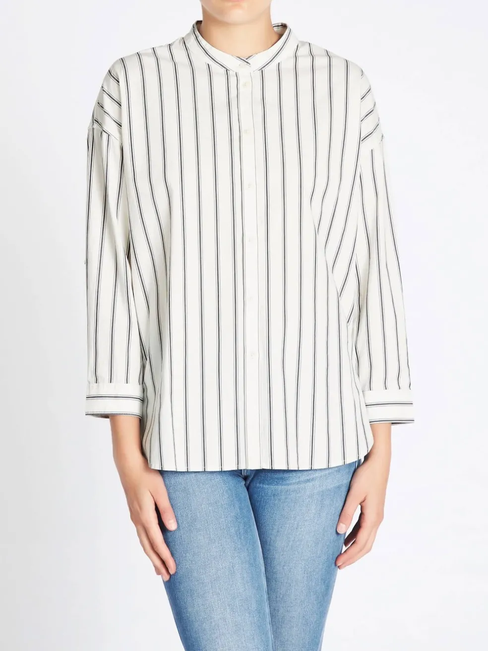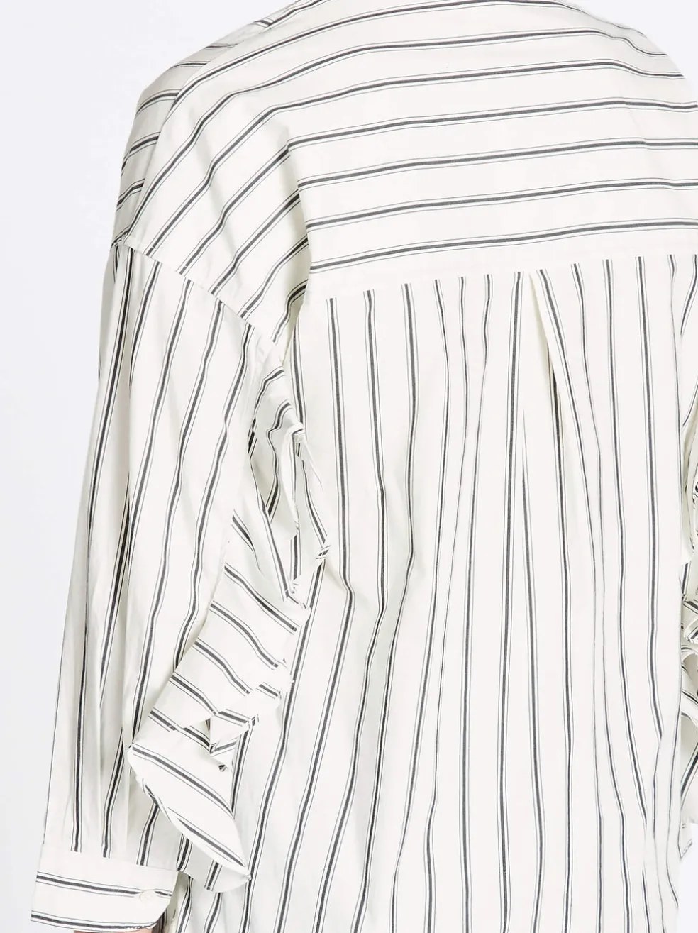 The Poni Shirt from Joie is a flirty take on your traditional button down. This oversized style has ruffles that run down the back of the sleeves, mandarin collar and a delicate charcoal stripe print.