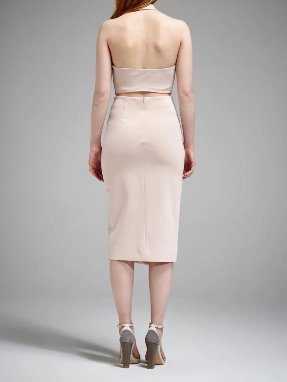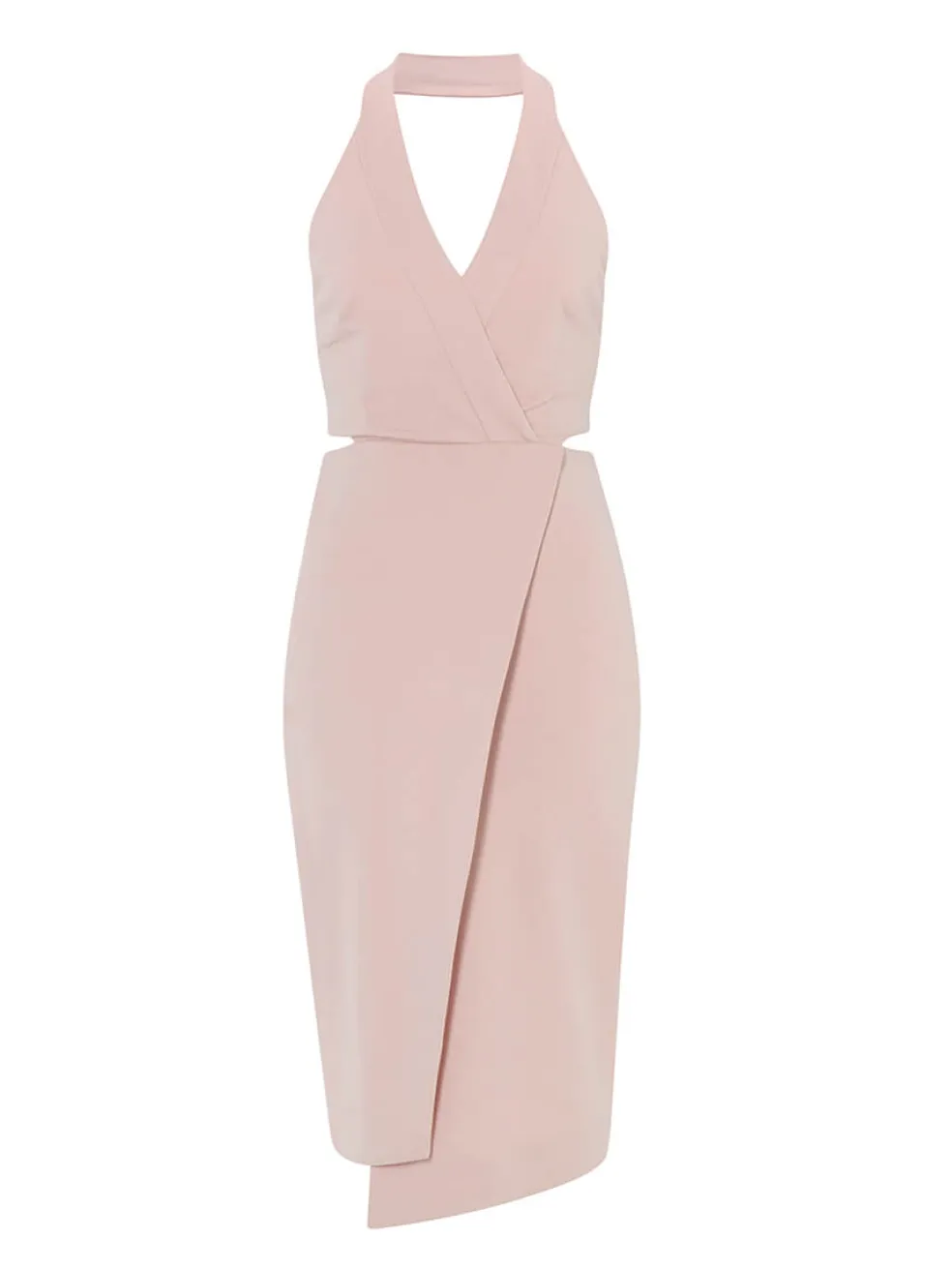 This faux Wrap Dress from N / Nicholas is a slim fitting, halter neck dress, and comes in a stylish blush pink shade. Full of detail, this piece is accented by an asymmetrical hem, exposed side zip detail and hidden back zip closure. This knee length dress has a sexy low back and cut out detail along the sides and on the back.