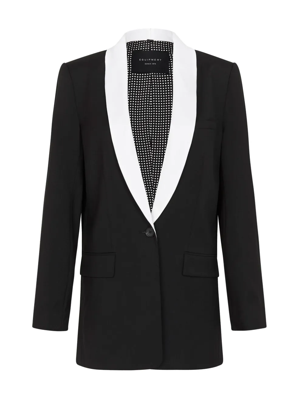 Be a Boss Lady in Equipments Quincy Blazer in True Black. Constructed from a stunning wool this oversized blazer features a 35cm / 12inch deep contrasting lapel, single waist button closure with two pocket flap details and is finished with four button sleeve closures and left breast pocket detail.