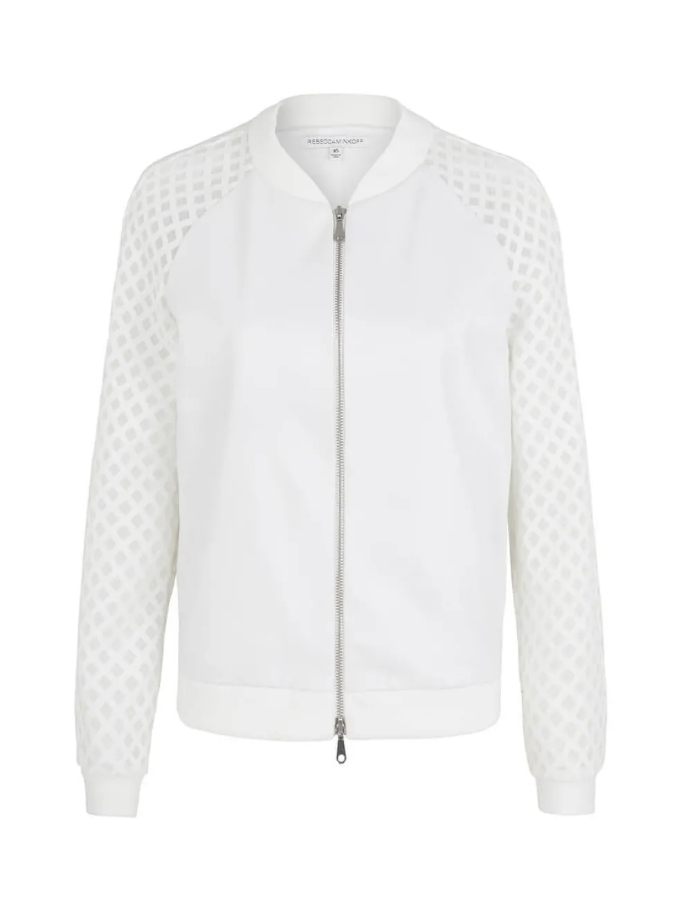 Get on top of the Sports Luxe trend with this leather bomber jacket from Rebecca Minkoff. With cool neoprene mesh sleeves in a crosshatched design, and ribbed detailing along the neckline, hem and cuffs, this piece is sure to give you an extra edgy look.