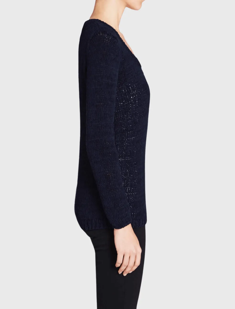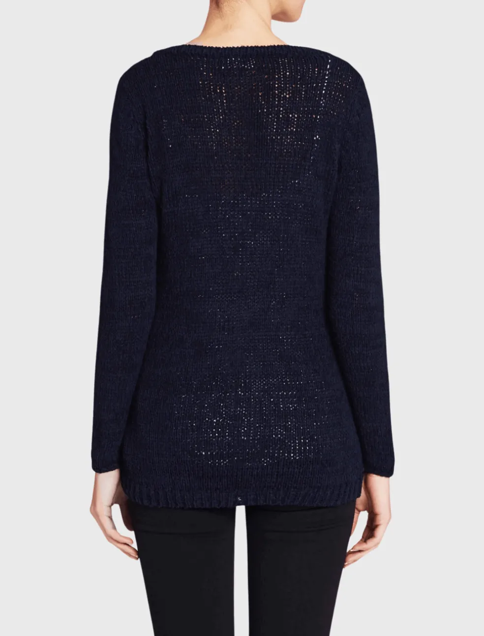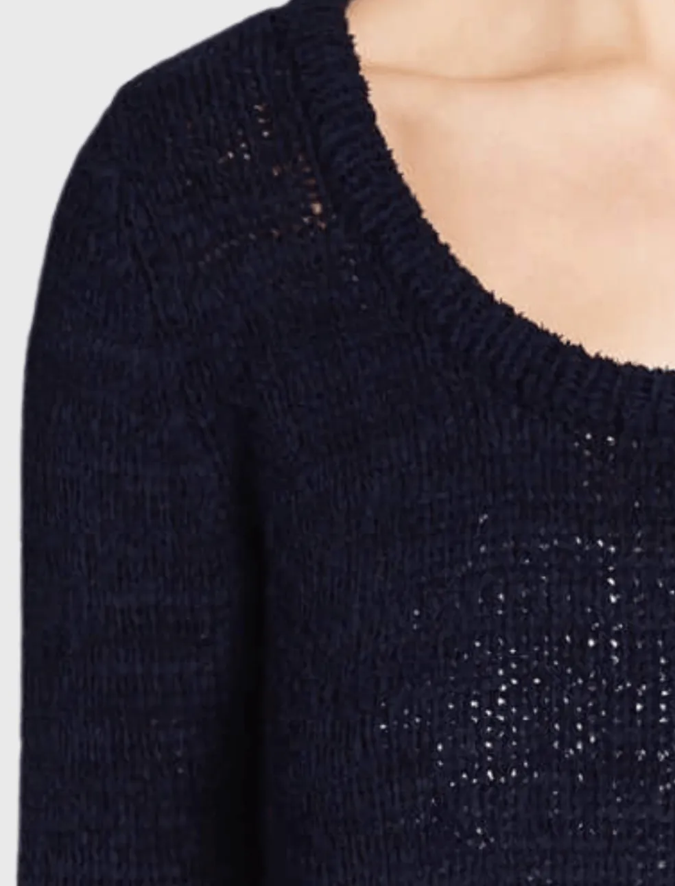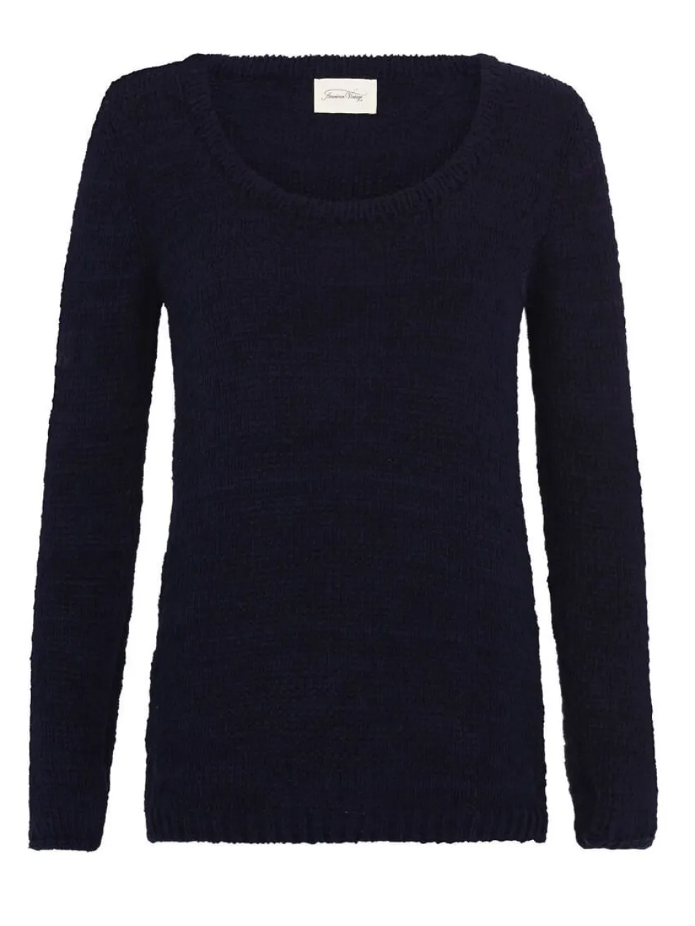 American Vintage‘s Saiastate chunky Knit sweater in Navy is styled with slightly dropped shoulder seams, a scoop neck and a relaxed silhouette with fitted sleeves.