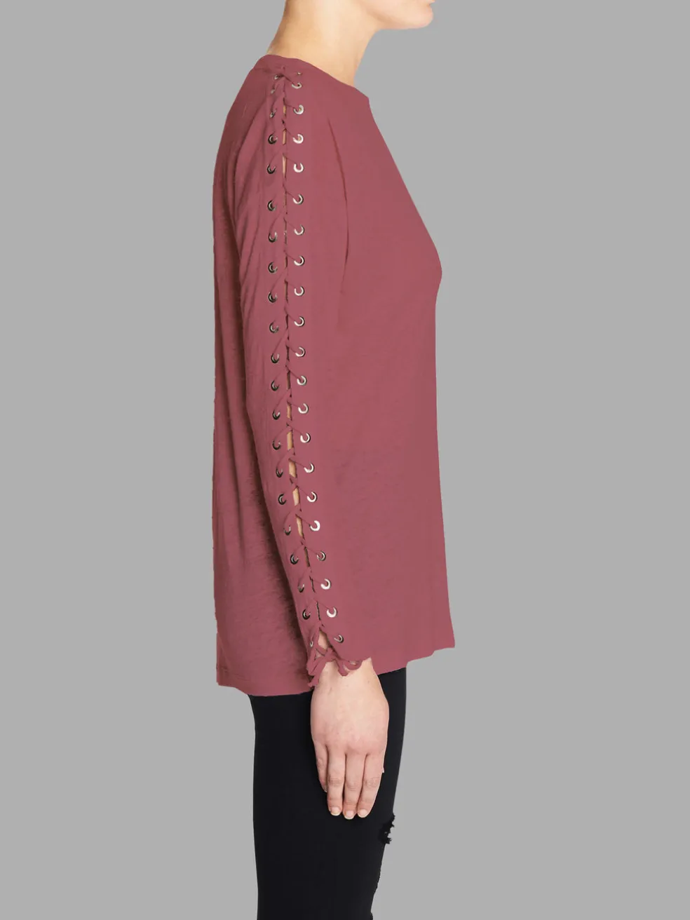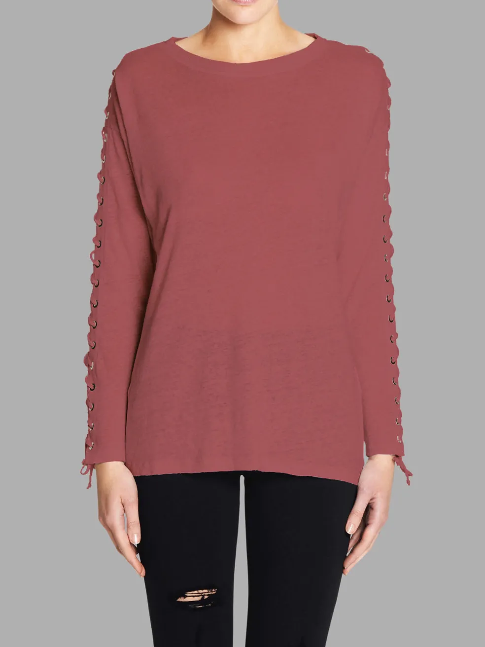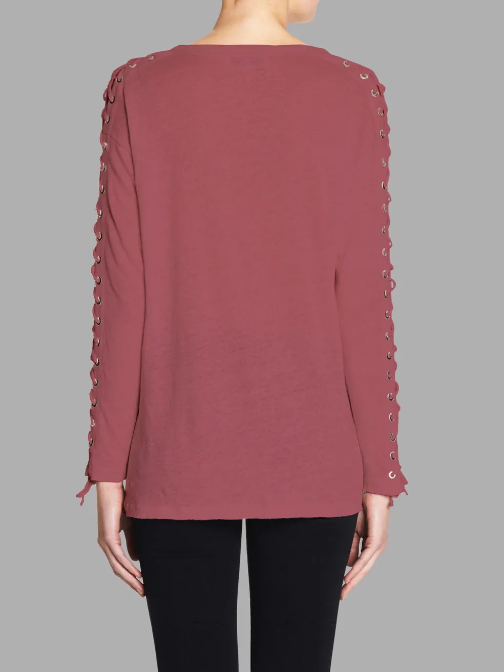 The Salim Top by IRO is constructed in a lightweight linen jersey and features lace up fastening details through the sleeves with loose end ties designed to drape over your wrists. Team this piece with your favourite denim for an edgy-casual style.