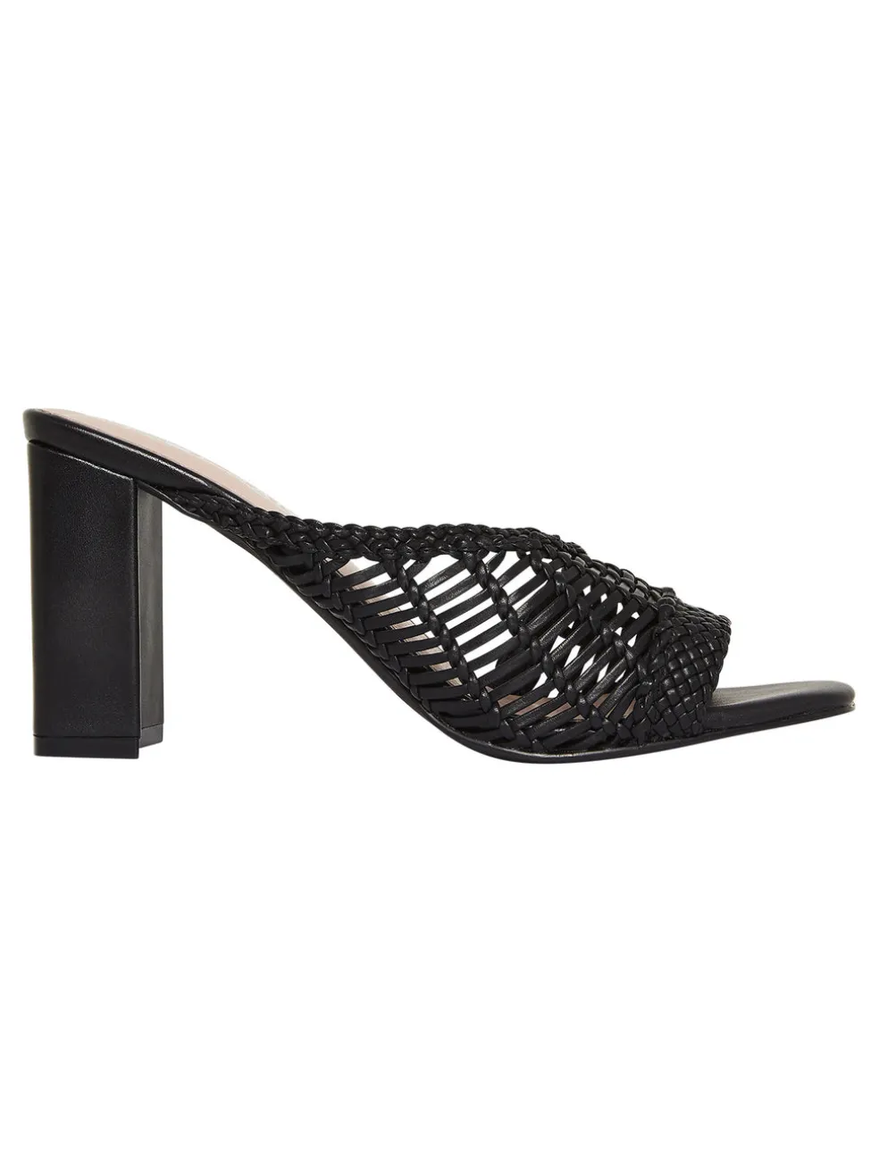 Step in style with the Sol Sana Sammy Mule in Black. With a 9cm block, heel these open toe shoes feature a curved strap across the vamp constructed from a basket woven leather for a summer ready finish. Team with straight leg jeans and a simple crew neck tee for elevated off duty style.