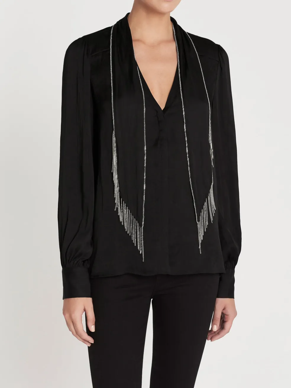 Add some glam to your look with the Paige Selene Blouse in black. Constructed from an ultra soft matte satin this long sleeve top features a v neckline, centre front opening slightly puffed sleeves with prominent cuffs and is finished with a detachable chain-detailed scarf. Team with black skinny leg jeans and heeled booties for the ultimate date night attire.
