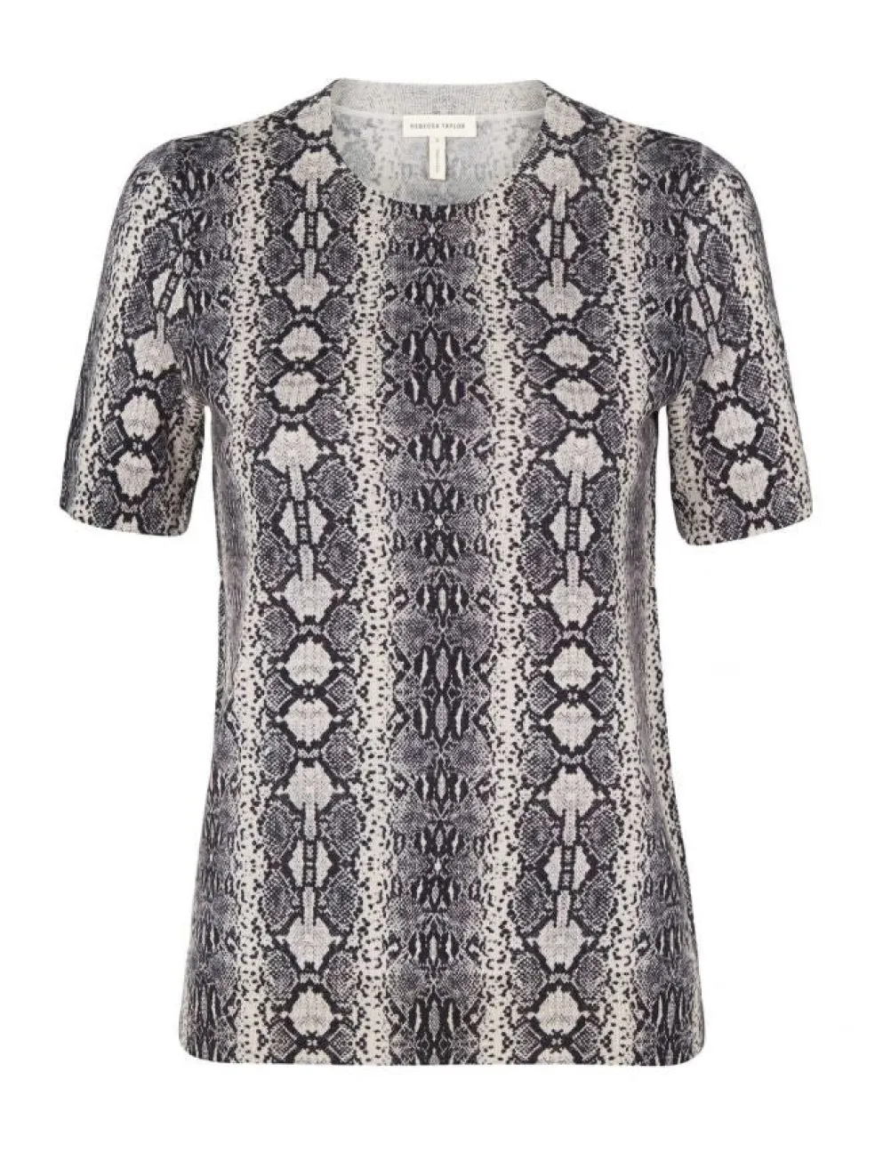 The Rebecca Taylor Short Sleeved Snake Print Pullover is a fine knitted top. The slim fit crew neck knit features an exotic snake print in pink and grey with a rib finish at the neckline, cuffs & hem.