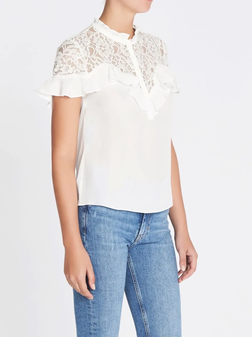 Add some dark romance to your wardrobe with the Rebecca Taylor Silk and Lace Ruffle Top. Constructed from 100% silk this button up blouse features short sleeves and a sheer lace yolk trimmed with soft ruffles for a feminine touch. Dress up with your favourite black skirt or dress down with a pair of black jeans.