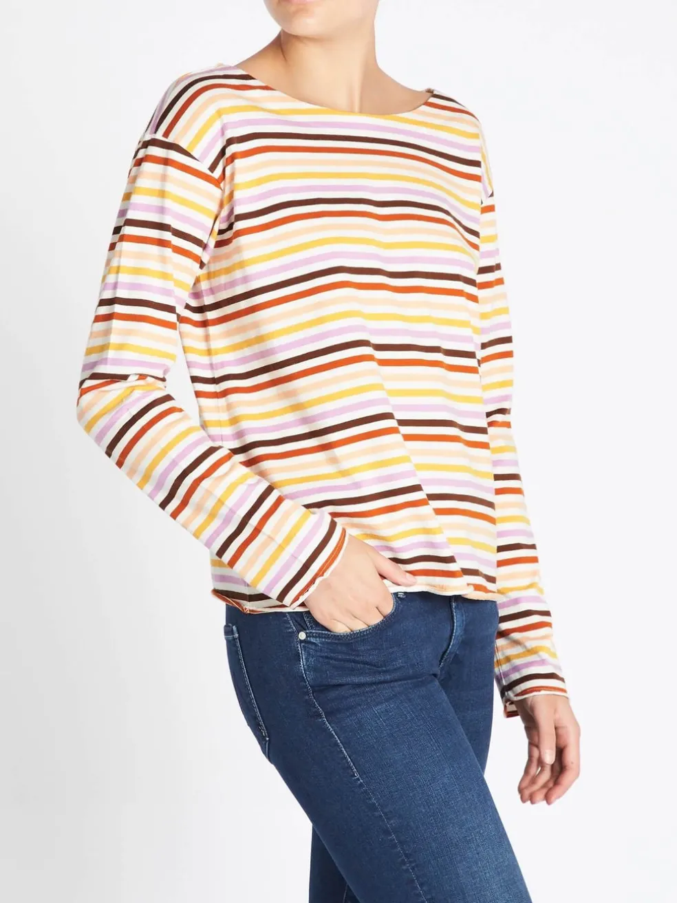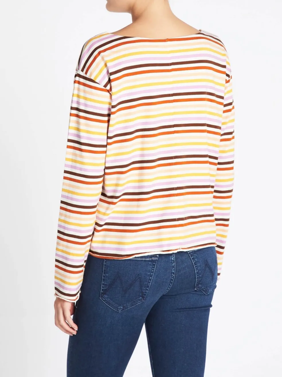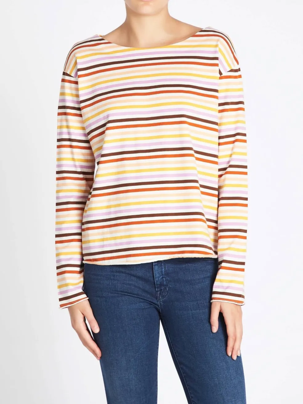 M.i.h Jeans presents the Simple Mariniere in Sunset Multi, a boxy fit jersey top that’s the perfect off duty must have. Constructed from 100% cotton this multicoloured sunset inspired stripe top features long sleeves, a rounded neckline, drop shoulders and is finished with raw edges for a modern twist.
